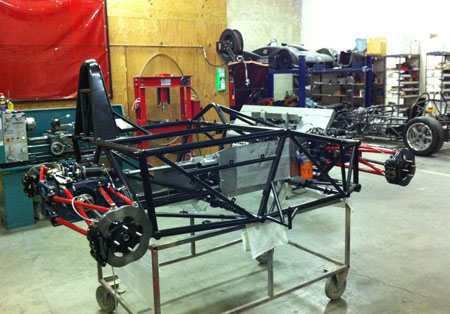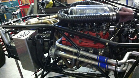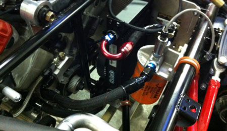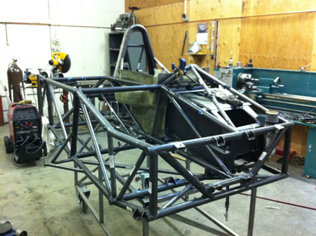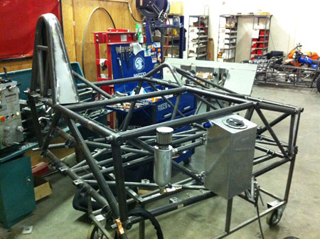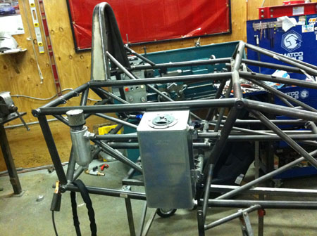 It will probably take us a couple months to get this car finished because of everything else going on. The driving season is pretty much over around these parts so unless we take it down south we won't have a chance to run it until March. 02/03/12 Time flies. It is now February which means that if we want to run this car in March we better get going on it again. Before sending the frame off to powdercoat I looked at packaging one more time and decided to move the oil tank from in front of the engine to the side. This accomplishes several things, the most important one being a big improvement in cooling airflow around the engine. A revised intake system is also in the works.