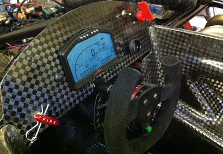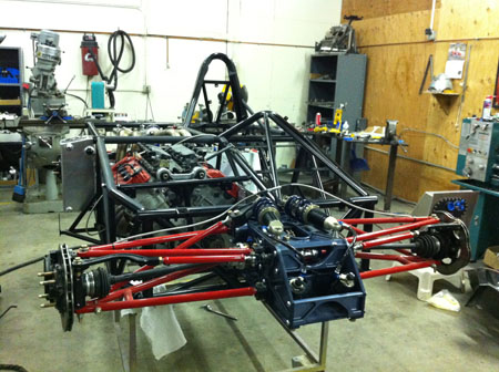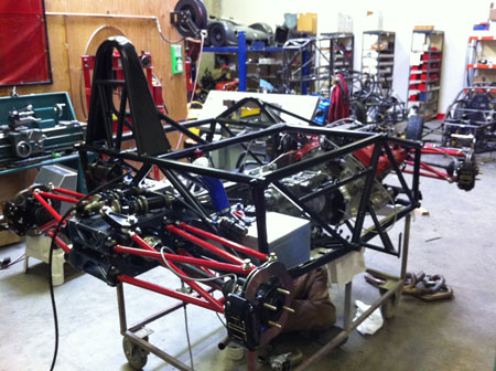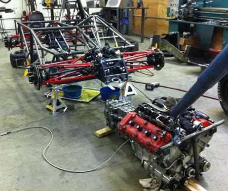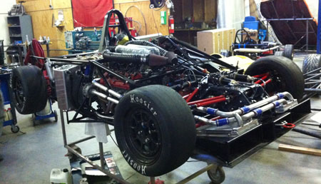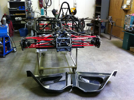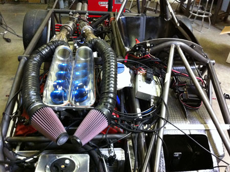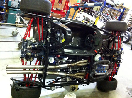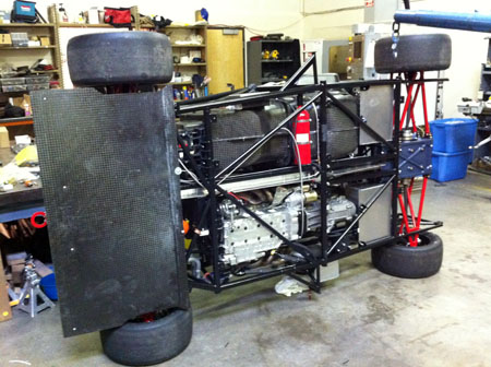 Until the Pikes Peak car is drivable, the D1 will serve as the aero development platform for that effort. As part of the miscellaneous updates I'll be installing a set of strain gages on the suspension to give us a definitive reading of the downforce being generated. This of course is in parallel with all the other things we're doing. 04/16/12 Fired up the engine today. Still a bit of tidying up left to do on the wires and plumbing but shortly the car will be ready to go. Karl is coming to visit and the plan is for him to drive it on a couple of tracks. Friday and Saturday we'll be at the new Ridge track in Washington, next week at ORP. There are quite a few developmental changes since the last time the D1 ran, primarily in the oiling system and the installation of the production Pilot Pod and some heat shielding.