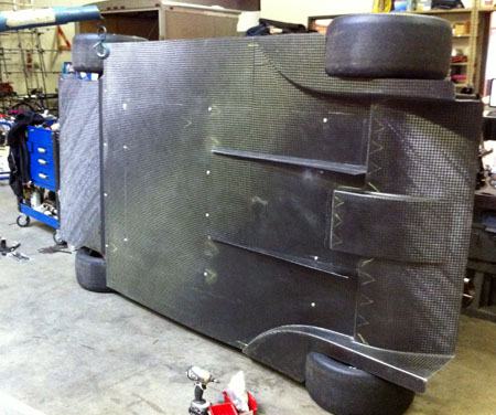 From here the refinements get more subtle but they'll continue for a while. We're planning to redo the intake plenums, parts have been ordered but won't be done in time for the next round of tests. I'm particularly looking forward to the aero work and testing. Much to be learned there and it will tie in with the Pikes Peak effort. Speaking of which, much progress there too - will update the sponsor blog shortly. 04/19/12 Getting ready for the first real track drives, tidying up various systems, fabricating catch can, getting the floor installed... This is just the initial aero configuration, it will definitely change as we test and learn.