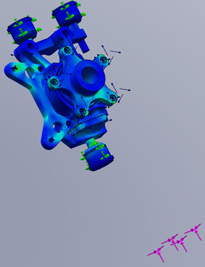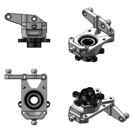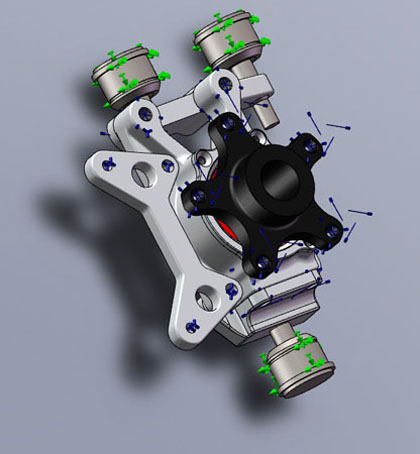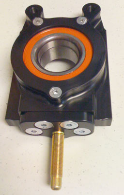 Other configurations will follow soon including those using balljoints for street applications, 4x100 hubs, Ducati pin drive hubs, 10.25" vented brake packages for lighter cars, etc. Custom drive axles will also be available with a variety of CV options. Email me for details. 03/01/10 Among all the other stuff, progress continues on the uprights. It's amazing how many things I find that need changing after I step away from the design for a couple of days and then get back to it. All part of the process. So in all this I've come to realize that I need two different 'lines' of uprights (well, ok, I kind of knew it all along but was hoping to get away with just one - wishful thinking). So now there are the 'GT' uprights, sporting a 5x114.3 bolt pattern, a massive bearing and large CV with 1.25" spline. The weight without brakes is 8.0lbs and with the 11" brake package it's 19lbs (12.19" rotors can be used with approximately 4 lb weight penalty). These according to FEA are good for cars up to 2,000 lbs and over 600hp per axle using 4g as the load test. Heavier cars can be accommodated if lower loads are acceptable but I'm not sure why anyone would want to. The second line is the 'LT' series geared towards cars under 1,500 lbs and under 300 hp per axle. They have a 4x100 bolt pattern, a more appropriately sized (but still very generous) bearing and more compact/lighter CVs. Weight is 5.75 lbs without brakes and 16lbs with 10.25" vented setup (smaller/lighter is possible). All weights listed are without CVs. CV eliminator adapters are available for non-driven axles for both designs.
