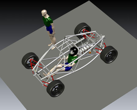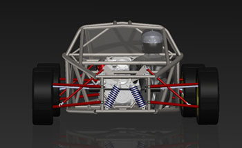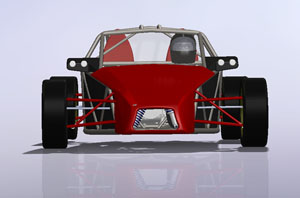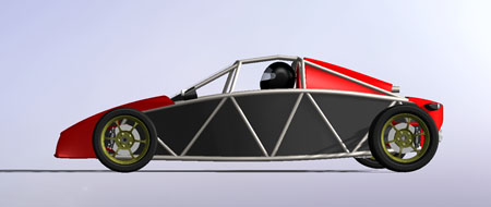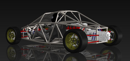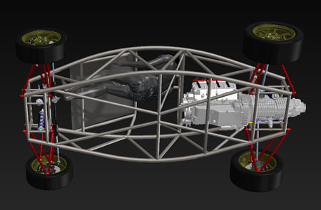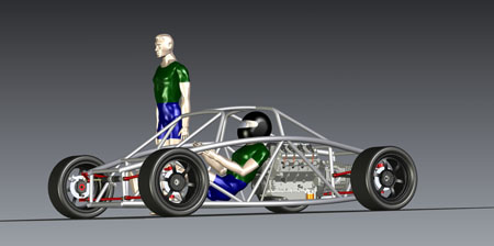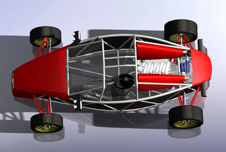 The engine has the same power as the Hartley H1 used in the dp1 but it's considerably larger, more than double in displacement and nearly 2.5x heavier. On the other hand it's a lot cheaper and EPA legal. Each is perfect for its intended application. Horses for courses, as the saying goes. It's fun to do projects using each approach and seeing how the tradeoffs play out. So yes, the dp2 will be using these engines and yes when built as a kit it will be street legal. Still targeting about 1,600 lb weight. Have a few more styling ideas in my head, too, so eventually I'll get them in CAD. When that happens expect to see more updates here, and much more progress. My goal is to have the first dp2 running by late summer/early fall of this year. Stay tuned. 04/28/11 Today is a significant milestone for the dp2 project - we now officially have a Lead Customer! This is the third implementation of the program - we normally have one Lead Customer per car model, with dp4 and dp1 being the first two. Among other things the program gives the buyer an opportunity to influence the design as it's being finalized by providing feedback on features, specs and styling. Being fairly public about the development process we do get a lot of input from people who follow us on the web but the Lead Customer program gives us a unique opportunity to hear from enthusiasts who have a real vested interest in the outcome, at a time when changes can still be made with relative ease. What this means for the project overall is that there will be a lot more progress to talk about soon. I'm rather excited about it - this car is different from our first two offerings by being a two-seater and by being a streetable design, built around an emissions-compliant powertrain package. This makes it much more of an all-around enthusiast's car than the intensely track-focused dp1/dp4. 05/08/11 Work on the dp2 design is progressing. I'm now finalizing chassis and suspension details, making additional room for components and tweaking the overall architecture. A key goal is to provide a very strong 'survival cell', an area in which the Atom design is sorely lacking in my opinion (in fact this is the primary motivation behind doing my own 'exoskeletal' car). The overall layout actually lends itself to this quite well and the resulting structure is fairly elegant. Should be very stiff as well. Naturally, like in my other cars, all tubing is aircraft-grade seamless 4130.