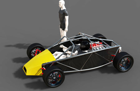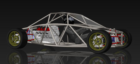 Much has changed since then and with the dp4 taking the top priority, that design has evolved the most. The dp1 has changed a lot too. With the dp4 entering production it is now time to address the other designs a bit further. From the beginning I have been a fan of the concept and the styling of the Ariel Atom and truly consider the exo-skeletal design a breakthrough. After more than a century of automotive development those are hard to come by. This is why I had bought one, but my experience with the car has left me frustrated. I had to redesign the uprights, bellcranks, try to stiffen the chassis and so on. And even after all that the car is, in my personal opinion, still compromised. So not being one to just sit back and complain about how other people do things I set out to do better. Some early developmental renderings from a year ago show the concept: