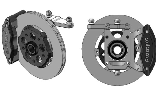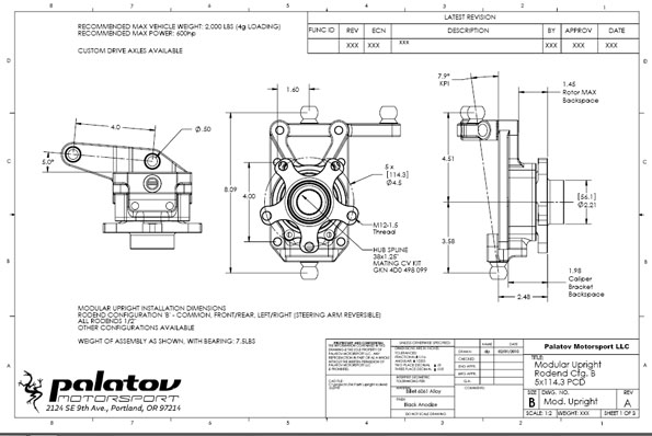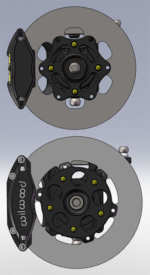 The design goal is to be able to offer a range of geometry and component options as well as high strength and stiffness with the ability to support full-on race cars up to 2,000 lbs with over 600 hp. The FEA plots above show the test case - using a 25" OD wheel/tire at 5 degrees caster and 1" scrub radius. A 2,000 lb load is applied upwards. Simultaneously another 2,000 lb load is applied laterally and an additional 2,000 lbs longitudinally (this is over 2,000 lb-ft braking torque!). This equates to roughly 4g loading on the suspension at top weight and is a very extreme case (like hitting a curb with outside wheel at maximum cornering force with brakes near lockup). The results indicate that the design is strong enough for the test case and experiences only 0.5 degree twist at this load. The entire assembly, including upright, bearing, hub, steering arm and caliper bracket is almost exactly 7 lbs in weight. The uprights will be made from aircraft-quality heat treated billet alloy to avoid potential porosity and other issues of castings. So, the dp2 is now officially back on the development track. Look for more on the uprights shortly, then other news will follow. 02/05/2010 As promised, here's some info on the uprights. The first version is designed for cars of dp2 size and power (up to 2,000 lbs and up to 600+hp). The exact specs can be downloaded in pdf form here. The pricing will be similar to the Atom uprights at $750/corner including upright, steering arm, camber shims, lower bracket, bearing and hub. Wilwood brake packages will be available at about $650/corner complete for 11" vented rotor setup with 4-piston radial-mount calipers. These uprights use large sealed bearings (82mm OD), have shim-style camber adjustment (allowing camber changes without affecting toe), the ability to use a raised lower suspension arm for clearance of underbody aero and weigh about 7 lbs complete with no brakes. Their modular nature allows them to be easily adapted to an almost unlimited range of geometries and mounting styles.