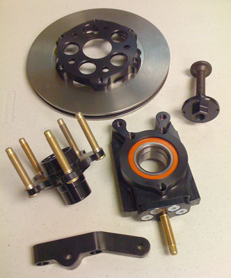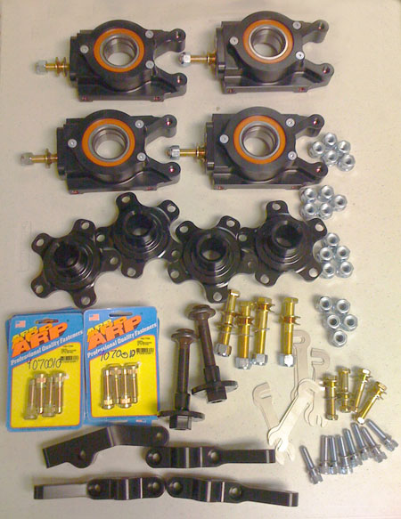All the hardware is included - bolts, rodend safety washers, camber shims, locknuts, wheel studs and even lugnuts. Fronts also include 'CV eliminator' kit using an M16 bolt and a custom 4340 steel flange nut to hold the hub together. A typical set of uprights comes with all of the parts shown below (except that unless requested otherwise the uprights come fully assembled).