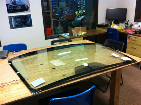 10/4/11 There was a lot of reaction to the styling updates. Most was very positive but some strongly preferred the earlier, cleaner look. So I thought it would be good to illustrate just how easy it is to customize the D2. Because the structure can stand on its own, you can either leave it to speak for itself or change the look with any combination of panels. Below are some pictures in the 'new' and 'simple' configurations. Endless others are possible. Obviously the nose and tail pieces are changeable too if one wants to go that far. The plan is to eventually have a number of panel kits, including full length side panels, full fenders and enclosed cockpit. They will all be bolt-on so an owner can change them after buying the car and can in fact have more than one set for different occasions. Some will take minutes to swap though others may be more involved. Optional wings, diffuser and floorpan will also be available. 10/5/11 More progress, this time on real parts. Picked up a windshield - it will be cut into 3 pieces for the main glass and two sides. I have a few leads on who and how can cut it but I'm sure it will be a learning process. Have done some research on the web and talked to a few people. So far it looks like many people think they can do it but breakage is a common thing. The leading process under consideration is waterjet but I suspect there are tricks to how to do it right.