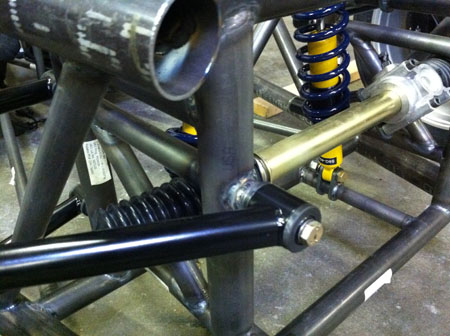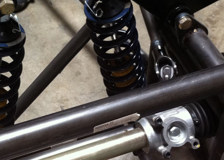 With the seats in it's easier to visualize all the other systems and parts, including interior panels. I now have a modified approach from what I was going to do before I saw this in the flesh. Also, things we're doing for the Pikes Peak car are influencing this design (and vice versa). In some ways it's very good to have a number of simultaneous and diverse projects. They cross-pollinate well :) One thing I kept meaning to do is test the suspension arm mounts. The design (actually quite similar to how some production car suspensions attach, the Corvette for example) may look a bit iffy. I did some calculations at the early stages and they showed the fitting should fail at about 6,000 lbs - keep in mind the entire car weighs 1,600 lbs.