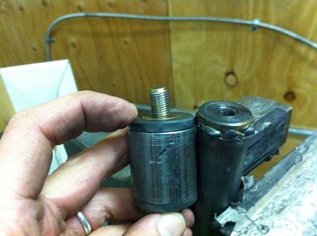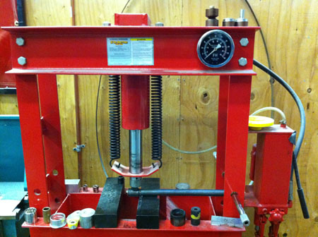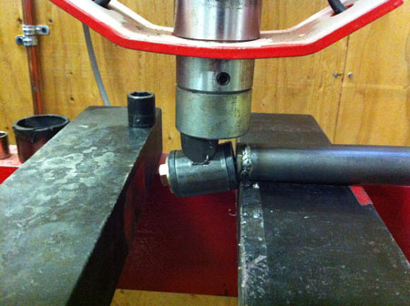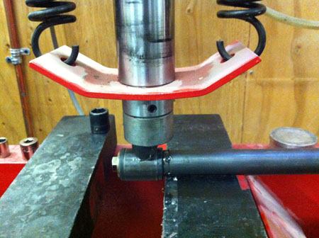 You do want a 'safety valve' in the suspension, something that will break in an impact without bending the frame. The trick is to make sure it doesn't break in normal use, even if 'normal' involves hitting an apex curb under 2g load. So I came up with a test fixture using our hydraulic press.