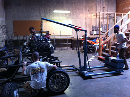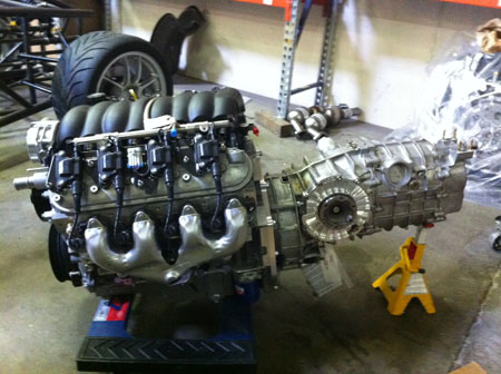 It did so at 4 tons (8,000 lbs) and did not completely break but rather it yielded. This is very encouraging. As a backup plan I had been thinking of various ways to reinforce the mounts if the test was not successful. Now it's one less thing I have to worry about. The design is shared with the Stiletto so everything here applies to that car as well. Two birds with one press. Now on to the multitude of other things. Engine/transmission install is next for the D2. 04/16/12 Currently waiting on some bits and pieces to be fabricated before more visible progress can happen on the D2, but we did assemble an engine to its transmission and the various adapters.