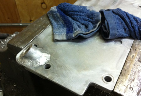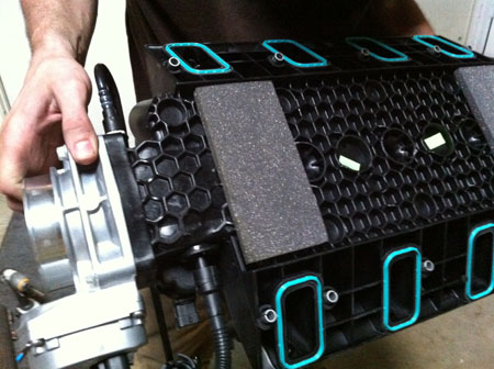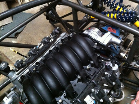 I really like the all-engine 'posture' of the D2. Yes, this is exactly what I envisioned when I added it to our list of designs to develop. Size of an Exige, 400 lbs (25%) less weight, twice the power and torque. Just about right. Getting both the first D2 and the Stiletto running are among the top priorities going forward. Much work needs to be done and true to our core philosphy of leveraging technology across several designs, work on one will directly apply to the other. So we have now test-fitted the engine and transmission in the first D2. Getting the wiring, controls, exhaust and other systems together is next along with a myriad other tasks. Stiletto will get its own blog updates shortly. I eagerly look forward to driving these beasts so that is added motivation as well. 09/06/12 Some tangible progress on the D2. Much of the design work lately has taken place in my head (it's all a part of the process) and some in CAD. There is also a list of concrete steps that we need to take to get to a drivable car. One of the items on the list is turning the intake manifold around so that the airbox can live behind the engine, where there is (more) room for it. The procedure is well documented on the internet by several bloggers. The issue is relocating the oil pressure sensor that normally prevents flipping the intake by sticking out vertically from a spacer plate, and interfering with the throttle body. Some solutions are better than others. For ours, Tristan has figured out exact angle that the sensor has to be at while still fitting in more or less the original location. Some grinding, some welding and we're one step further along.