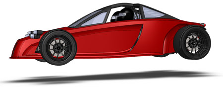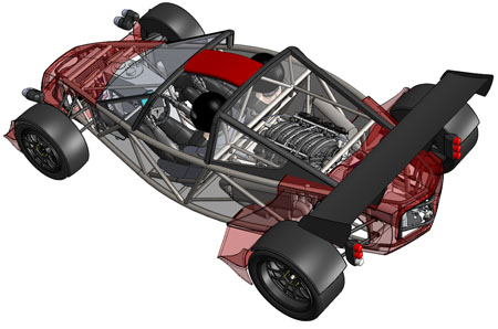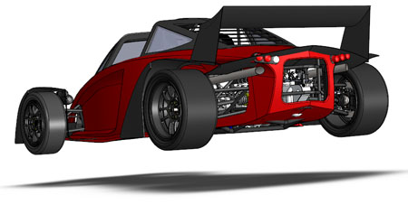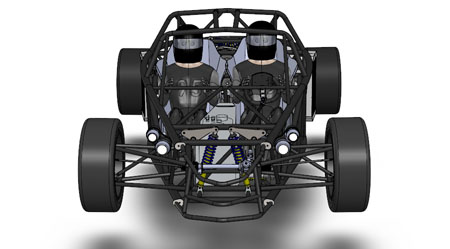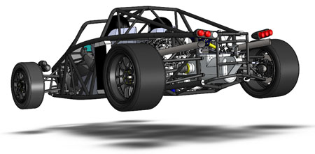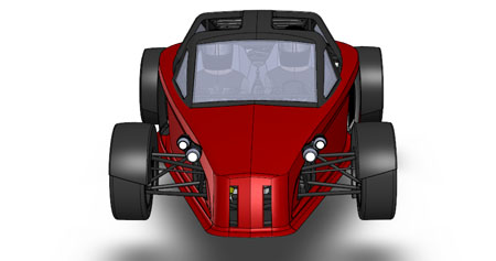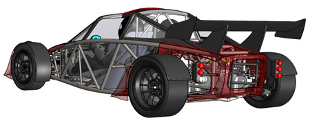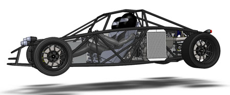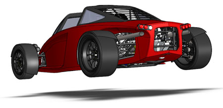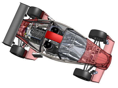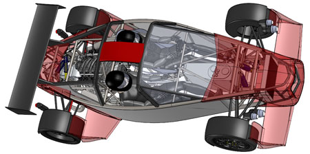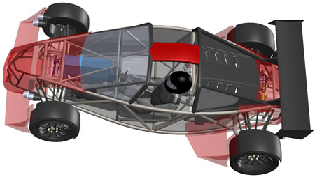 10/16/12 Design is an iterative process. There are some formal theories on 'top-down' vs 'bottom-up' but the reality is far less academic and much more opportunistic. You work on some parts for a while, maybe because of leadtimes, maybe because some new information just became available, or just because inspiration happened to take a particular turn today. Changes in one area affect lots of other bits so you propagate them throughout. Sometimes what seems like a cool solution at first turns out much less so once all the affected systems are updated. So you go back and redo... The D2 bodywork is a perfect example. There's the styling aspect of it, which is rather subjective. And then there's all the stuff underneath that has to fit and work. Moving radiators to the middle of the car (see earlier posts) is a neat solution to a number of packaging issues. But it means the bodywork has to be redone to work with the change. It takes a fair bit of effort to arrive at something that looks halfway decent. I'm now on version 'O', as in letter of the alphabet. Yes that means there were 'A' through 'N' before it, and that's just the major revisions. Below are some pictures of what the car looks like in CAD now. First just the chassis, then the 'base' configuration and then the optional aero package.