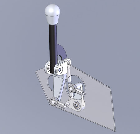 For example, the shifter mechanism is now on its 5th iteration and looking near-final. The challenge is to take up as little space between the seats as possible and still provide a direct feel. I've looked at several cable routing options which are a challenge. Any bend in the cable introduces both friction and play in the mechanism so the bends have to be minimized and made with as large a radius as possible. The details of the linkage must change accordingly.