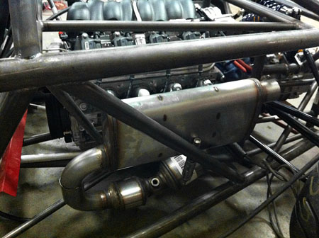 There are many other benefits as well. The fuel cell can now sit almost 3" lower. The nose is open to house a full size battery where it will help the weight distribution. The oil cooler now goes in the nose which requires far less airflow and therefore opens up lots of new styling possibilities. And, since I already have several of the radiators onhand using two per car doesn't slow me down. Cost impact is very modest and if someone wants to use just one there's always that option. Tristan has been hard at work fabricating the exhaust. In CAD it all fit quite nicely but in real world with large radius bends, overlaps and the need to align stainless steel segments accurately for welding meant that the low exit pipes are not practical. So we flipped the mufflers and now the tailpipes will come out the back. They can still be dropped down low aft of suspension if desired.
