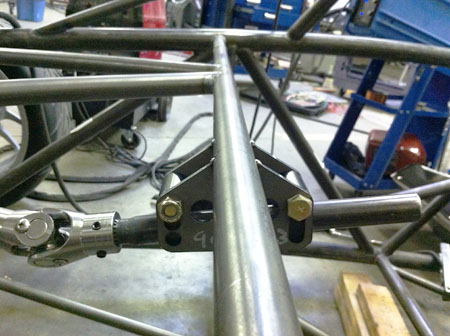 Steering linkage is also in. Note the height/tilt adjustment provisions in the second picture. The linkage uses 3 U-joints to keep angularity within reason and to provide clearance for larger feet. All the steering supports are sealed needle roller bearings.