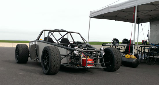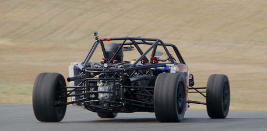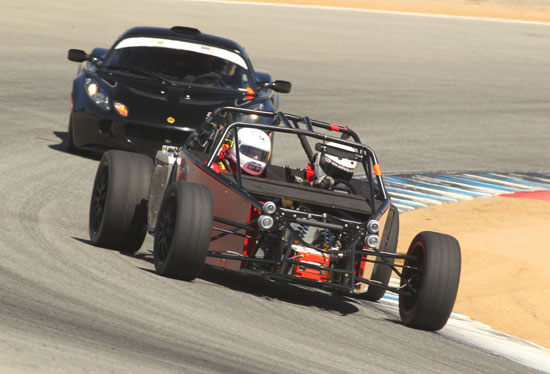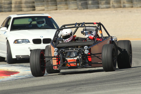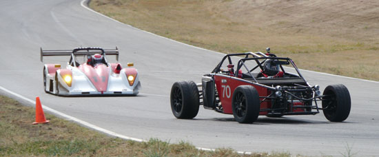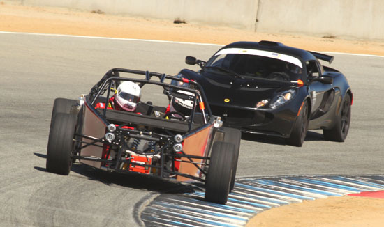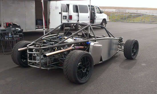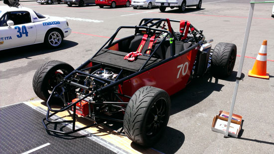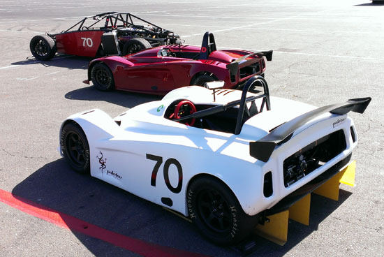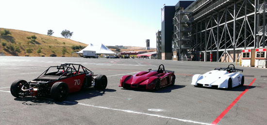 Today Karl is driving his D1 and Pete is scheduled to drive the D4 while M and I are in support crew and sales/marketing role. We weren't sure how ready the D2 would be considering that six days ago it was just a bare frame, but with another check of all bolts, nuts and settings I declare it track-worthy. Pete is eager to play with his new toy so after one session in the D4 he switched to the D2 and ran it for the rest of the day. Gratifyingly, the car worked very well and Pete's perma-grin tells me I have a happy customer :) Much to do of course before the D2 is finished and can be formally delivered but this is encouraging. Even in some pretty stellar company all the cars look good and perform well. We got a lot of positive attention and hopefully some leads on sales. Jonathan Frost, who drove our dp1/e at Laguna some time ago, was there instructing and was able to take the D4 out for a session. It was a lot of fun watching him and Karl run through a field of Ferraris and McLarens. I think we might have gotten some video of that, I still haven't had a chance to check the camera (in all the rush we forgot to charge them before the event). All in all a very satisfying day. Having all three cars there and running really made me realize we've come a long way. Which is good motivation for going forward :)