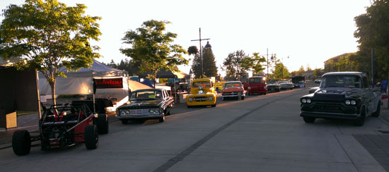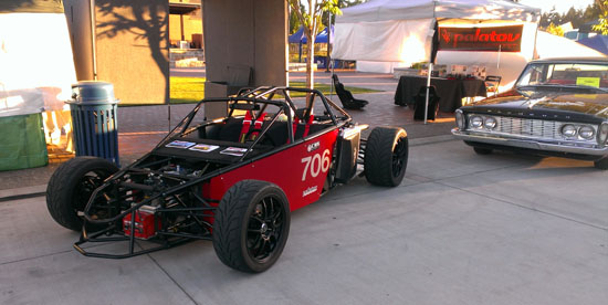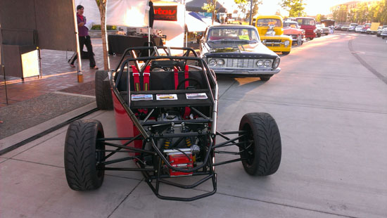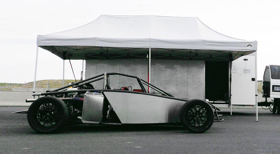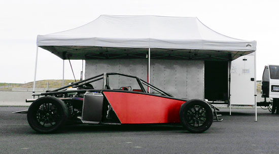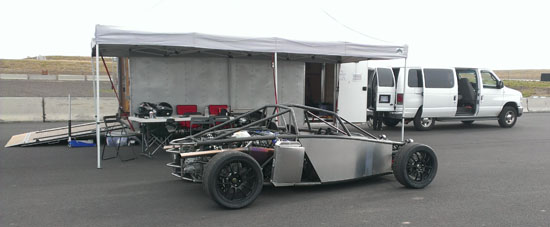 06/17/13 For not being a complete car, Pete's D2 chassis has been busy. There were two more track events, at ORP and PIR, where Pete got down to 1:52 and 1:22 respectively - pretty good times, especially for DOT tires. He is off to Thunderhill in a week. We also decided to try something new and take the D2 to the Sherwood Cruise-In. It was a last-minute decision and required setting up at 5 am (meaning getting up at 3:30). An interesting and useful experience as we need to step up our marketing and promotion efforts. This particular show had a mostly hotrod crowd but the D2 still got a good deal of attention and interest. The Stiletto would have been more at home here - that's next in the pipe after the D2s. The pictures below were taken at 5 am, it got a lot more crowded soon after.