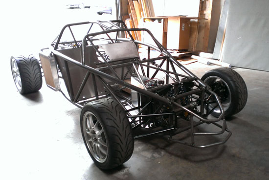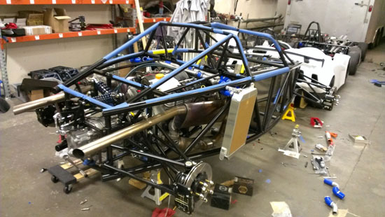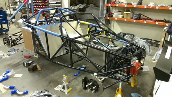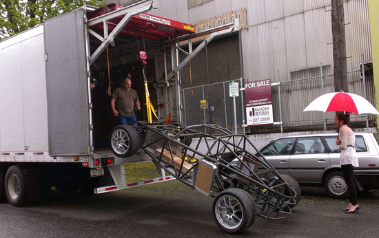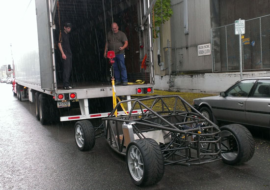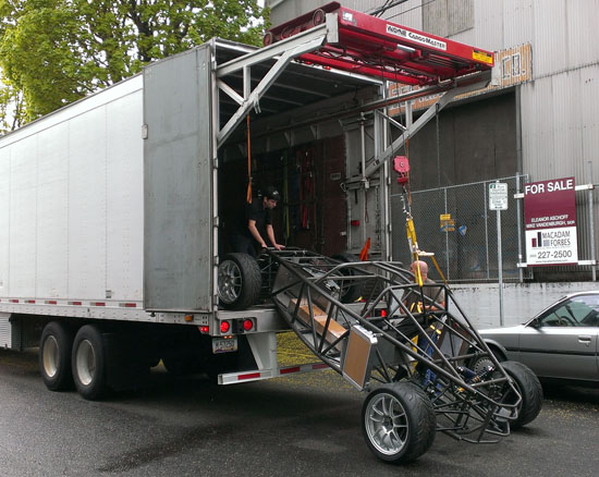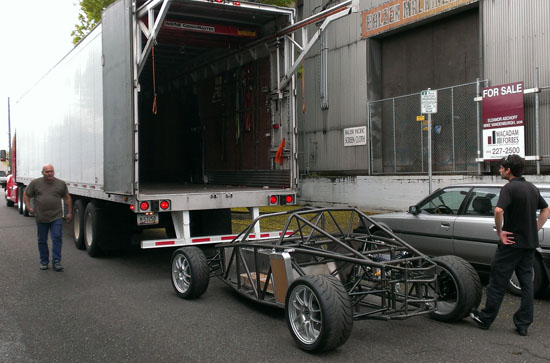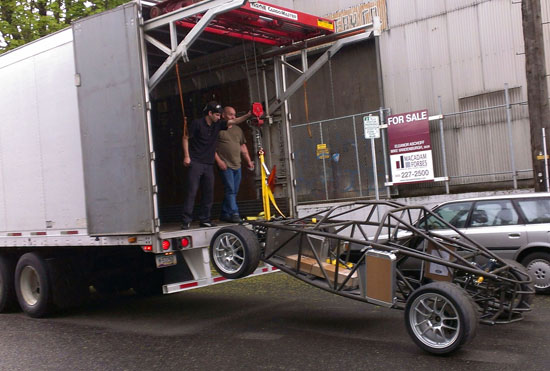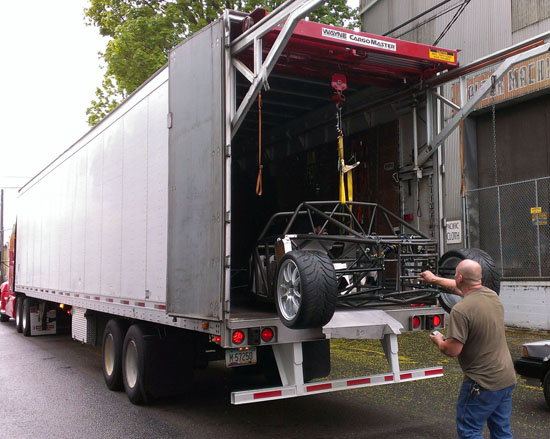 04/30/13 It's been almosts a month since the last post. Not because nothing is going on - quite the opposite. I just don't have the energy to post and it's tough to keep all the projects going simultaneously, so when I finally stop working for the day I just want to pass out. I'm also doing a D1 post today, but here's what's been happening on the D2: There are four customer cars in various stages of completion. The fourth customer is putting an LS7 engine in his D2. He has dynoed the engine already, it puts out 574hp. Should be fun in this light a car :) Since the engine install is different than our standard LS3 John is doing it himself and therefore wanted the chassis without powdercoat in case welding or other mods need to be done. This makes it easier on our end so a couple weeks ago we shipped out his chassis. The truck we arranged to pick it up has a nifty lift mechanism (they specialize in shipping car kits).