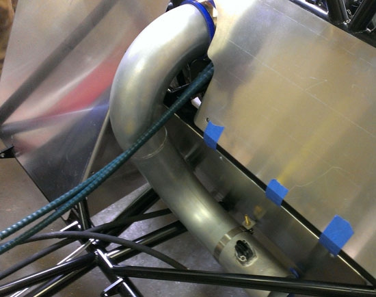 Pete eventually worked down to some 1:58 lap times which is pretty good for being on R888 DOT tires and the car still has a lot in reserve. Once the tires warmed up there was plenty of grip and Pete thinks the car will take more power with no issues. Good news for John who's putting an LS7 in his D2 :) The sound check came in at 88db so we're good for the 90db day at Laguna tomorrow. We did discover some things to work on - the diffuser needs to be redone, brakes need some tweaks, need to work on mirror placement, etc. Very promising overall. 06/04/13 Work continues full speed and we now have some extra help with Matthew, our new intern, having started a couple days ago. We've made many updates to Pete's chassis (brake fix, different steering wheel, steering rack stops, different shoulder belt mounts, proper catch can and so on). The other customer cars are in various stages of progress with a lot of welding powdercoating, assembly and other tasks going on. I'm also finally digging into the bodywork and my several experiments are working out quite well, so far.