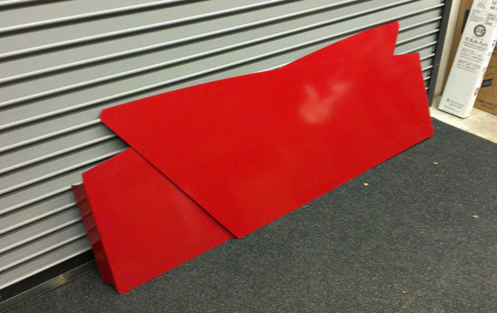 The bodywork won't be ready so we decided to try something temporary that would still look cool-ish. I did a quck p-shop test of putting color on the prototype's aluminum panels and it looked promising, so M spent a couple hours applying vinyl to them. We'll see how it looks in real life.