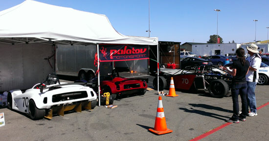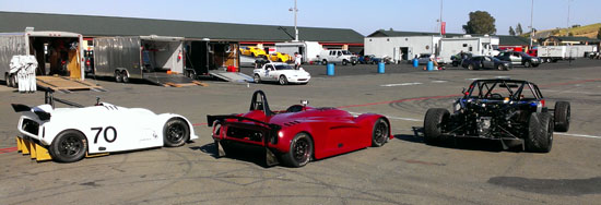 After some 30 hours of work over the weekend, Monday we loaded the D2 chassis in Pete's trailer, D1 and D4 into ours and headed for Sonoma. Arriving at the hotel around midnight, up again at 5 to head to the track. The day is beautiful and there is a lot of fun machinery in attendance. I counted five McLarens, over a dozen Ferraris including a beautiful F40, and lots of others. We set up the trailers, unpacked the cars and got ready.