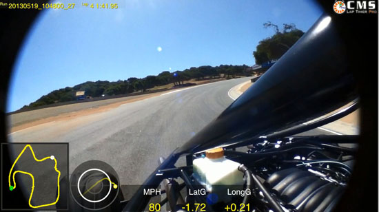 Even though the glass is flat, my visual tricks seem to pay off from several angles and make it look slightly curved. Of course we'll have to see if that works with real glass but it's promising so far. I've posted some stuff on the Sonoma and Thunderhill events, but nothing yet on Laguna. There's actually quite a bit to tell. Jonathan Frost drove the D2 and in a few laps got into mid 1:35s which puts us 5th in the all-time street legal car records. That's on street tires, with traffic and a brake issue which made for a few anxious moments. Jonathan thinks a 1:30 is very doable with some more development. Pete posted a video on youtube which looks quite fun. Also, a screenshot from his CMS lap timer shows an interesting thing: