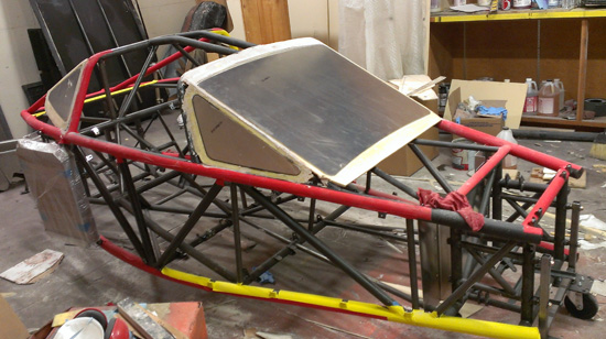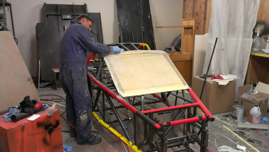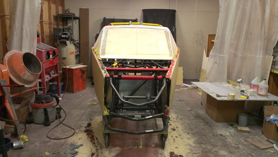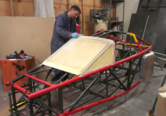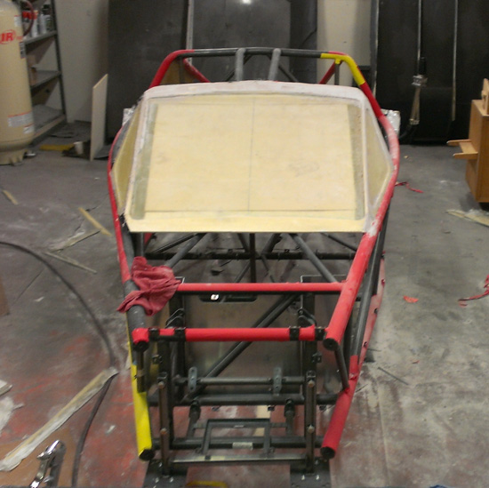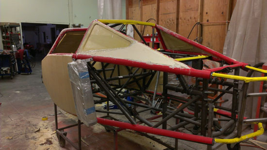 The bodywork progress continues. Part of the challenge is that in building the plug I can't build up too much material on the frame, it needs to fit as closely as the finished panels will. Also, it needs to be strong enough to pull a mold from it but not so strong as to make it difficult to remove afterwards. Most of the plug is being made from 1/2" and 1/4" thick tooling foam. The sheets are prepped by glassing one side, then installed on the frame (had to experiment with ways of attaching them). After the foam is in place it is sanded to a rough shape and then the other side is glassed. Then, lots of bondo and sanding.