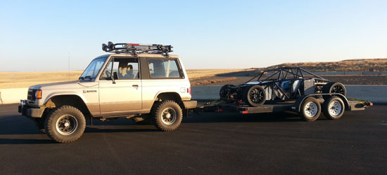 There are other things which I don't have pictures of at the moment - the production version of the dash hardware is here, the first one is installed on Pete's car (still needs some tweaking and configuration but working well overall). There will be a separate post on that later. The updated interior panel design is done and the first set is due in a couple of days. Same for fender mounts and a number of other parts. The work never ends it seems :) The next couple days are another test outing at ORP. Hoping to take some pictures and better video this time out. 10/17-10/18/13 The track season is winding down rapidly so we decided to take advantage of the unusually pleasant weather and go out for more testing at ORP. On the agenda - see how the new seatbelt mounts feel at speed on track, put more track miles on the new uprights, and even try to have some fun with all the work we've been doing lately :) We have now outgrown our trailering setup - the 20' trailer can take two of our smaller cars (D1/D4) but only one D2. So for next season I'm starting to look at various options. We now know that a big rig like the Mothership is too much hassle (storage, maintenance and generally getting in and out of places). The van we have now is great and we'll probably keep that. I'm thinking a 28' trailer will take a pair of D2s or 3 D4s and still be within its 7,500 lb towing capacity, if we add a weight distributing hitch. So that's the tentative plan. In the meantime to bring a D2 and a D4 out we had to borrow my old open trailer from Satya and have Tristan tow it with his Raider (Pete has his own trailer for his D2). Another advantage of light cars - this setup actually worked reasonably well.