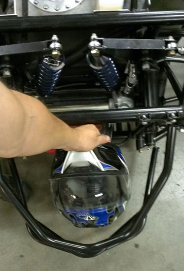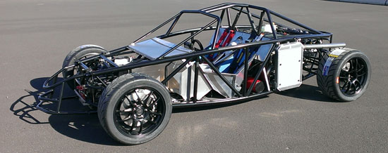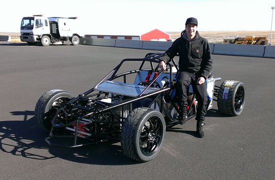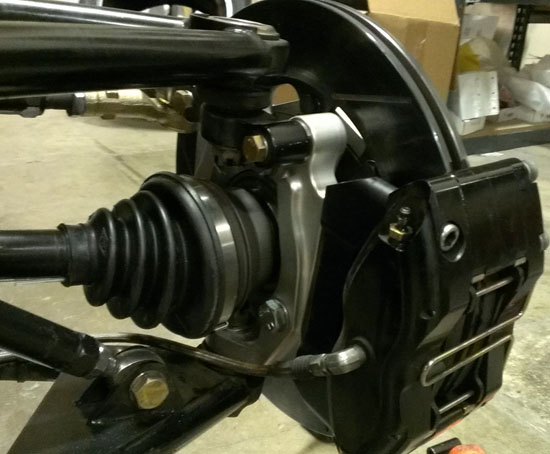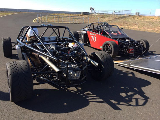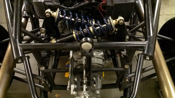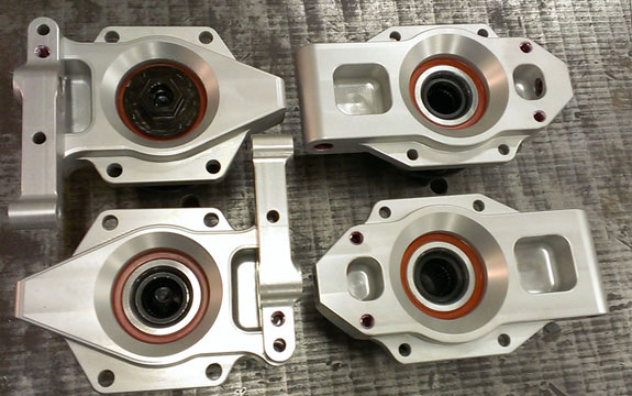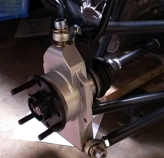 The nose panel will be big enough to fit a helmet through. The exact method of securing a helmet on the passenger side will be worked out later but I'm thinking something along the lines of a bungee net. You can also see how much the seats enclose the occupants - that's 1/8" thick aluminum. There is 4" of space between the side tubing (1.5" x 0.095" chromoly) and the seat, so there's some room for it to deform in case of a side impact. The seats themselves are being redesigned based on what we've learned in testing with Pete's car, for better comfort, better support and more room (yes it's possible to improve all 3). Naturally the early cars will get upgraded to the new spec. As with the uprights, it's emotionally dfficult to discard seemingly good parts which cost good money and effort to make, but it's all part of the development process. I have to make sure that the cars we put out are the best that we know how to build and my future designs will be all the more efficient thanks to everything that's being learned now. On a different subject, I've been asked what class the D2 would race in. After some research it looks like it would be eligible for ASR in SCCA (with some additional bodywork that will be optional) and in NASA Super Unlimited. It should also qualify for Pikes Peak Open class, I'm going to start that conversation shortly. 10/01/13 Well, the new uprights are back from anodize and on Pete's car (we discovered that even for this design not all bearings are the same - sigh). He's now off to Laguna to continue testing.