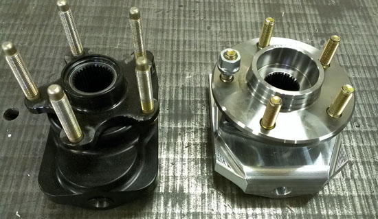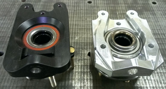 9/20/13 I had mentioned some suspension changes based on the experience we've gained with Pete's car. The gist of it is that the bearings seem to be developing play rather quickly, some even have it brand new. We did quite a few bearing swaps and eventually tracked it down to the fact that a particular brand (supposedly premium OEM one) is susceptible to play. Very surprising, especially since their bearings in our other uprights designs have been just fine, but there it is. While simply switching brands would address the issue, in the process of swapping out bearings I was reminded that this is not exactly a user friendly task. Looking at it from the customer's perspective, having to be careful about bearing brand and the considerable hassle and need for specialized equipment in swapping, makes the design somewhat less than ideal. I therefore decided to bite the bullet and redesign the uprights - a bit more effort and expense now (all the lead customers get replacement parts free of charge) but a lot less potential for problems down the line. The new design, code named GTX, uses a cartridge bearing/hub unit which is preloaded at the time of manufacture and doesn't depend on the axle nut torque to hold it together. Replacement involves just undoing three bolts and the axle nut, and can be accomplished without removing the upright from the car. This is compared to removing the upright (taking apart balljoints in the process), pressing the drive flange out of the bearing, pressing the bearing out, then heat-shrinking a new one in, pressing the drive flange back in and reinstalling the whole thing. Also axle nut torque is now 105 lb-ft instead of 250+. And the upright is stiffer to boot. All this of course doesn't come without a downside and in this case the penalty is 2 lbs per corner. But, all in all, it is the right way to go. Below are pictures of the original GTS (black) and the new GTX (silver). Looking at the pictures I realized that the camera lens makes the GTX seem smaller vertically - it isn't. The uprights are identical in the vertical dimension and the GTX is considerably wider horizontally (the last picture gives the best comparison).