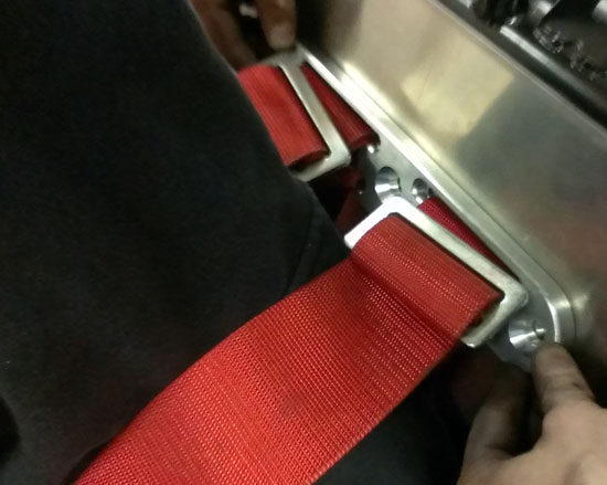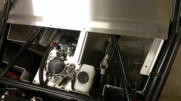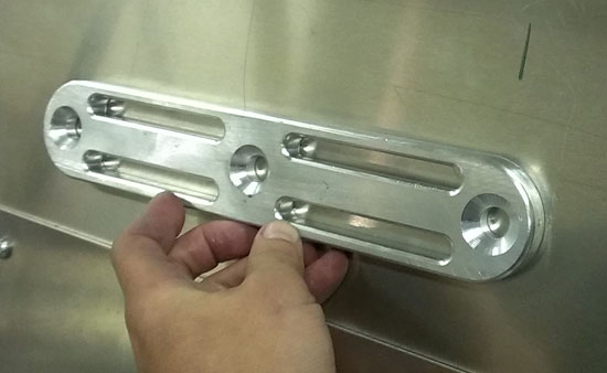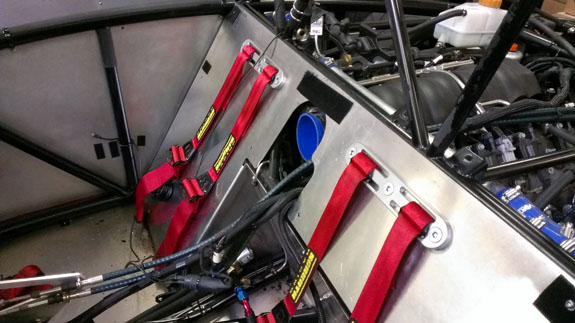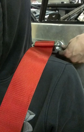 I rather like the look of clear anodize so I'm thinking that's what we'll do for a while on the parts we make and see how that works out. Speaking of making parts, I've had to redo the seatbelt attachment solution a couple times and I think the newest design will work pretty well. The challenge has been to provide the right height (and some height adjustability), sufficient strength and package it all in the compact dimensions available. The new solution consists of a 1/4" steel backing plate that goes behind the chromoly frame tubes and a 1/2" billet aluminum bracket to which the belts actually attach.