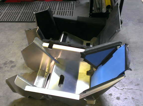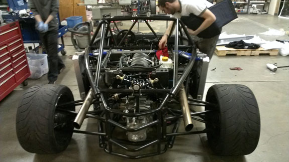 While it may look like the bracket mounts to the sheetmetal firewall, it actually mounts to the steel backing plate via welded-in standoffs. The bolts just pass through the firewall but it's not a load-bearing connection. Rough FEA analysis shows the design is good for at least 2,000 lbs per belt attachment point which for a 200 lb driver is the equivalent of stopping from 80mph in less than 10 feet (roughly 40g; the FIA spec is 32g). I will run a more detailed simulation later. 10/04/2013 Pete is continuing to fulfill his role as test pilot for track days number 18 and 19 for his car, at Laguna this time. There are worse jobs. We did learn that when wiring instructions say 'high impedance device only' they probably mean it. I had all kinds of hollywood images in my head when I was telling Pete to clip the orange wire that connects to the purple wire, via cellphone, to make his car run again. Geeks like ourselves will appreciate this, normal folk just take our word for it - it's cool in a frustrating kind of way. I now own an extra throttle pedal sensor. In other news, we've had another visit and now chassis #10 is spoken for. Part of it was checking out the progress on the bodywork molds and indeed there is a bit of that.
