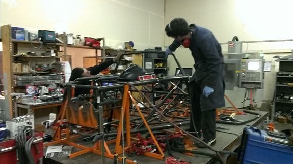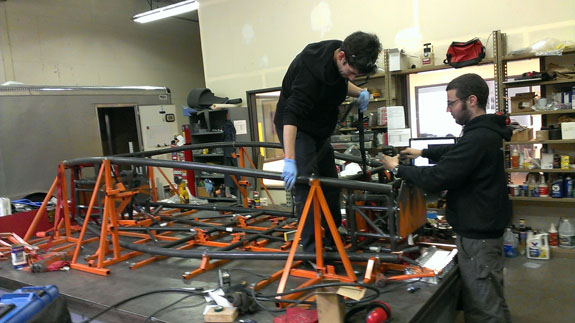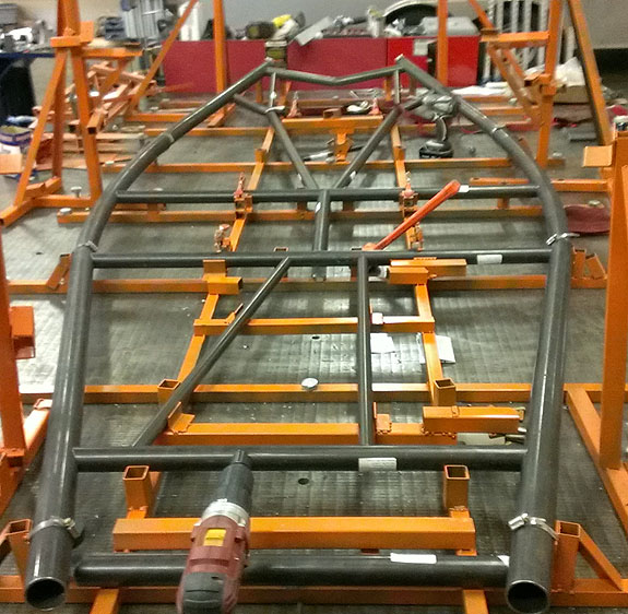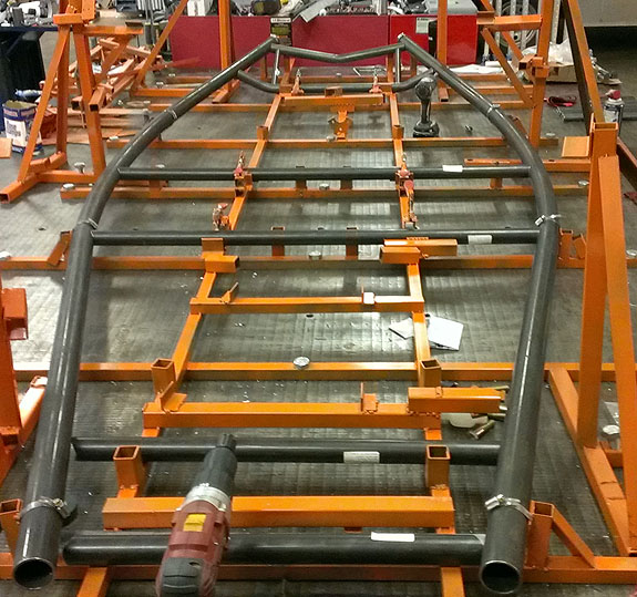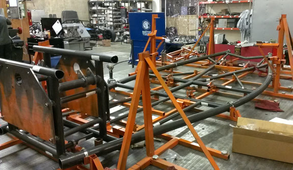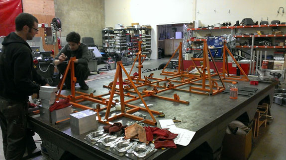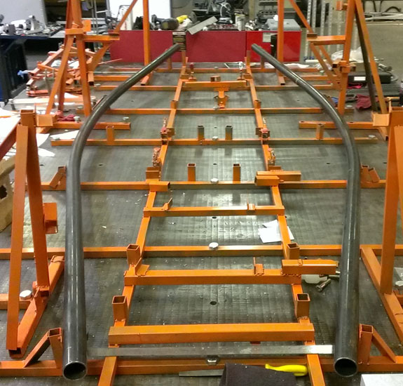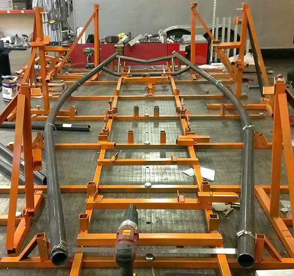 The molds are done, now they get steel outer frames and a post-cure. Then the first body finally gets made. The bent chasiss tubes are here, the fixture is on the table and welding has started on chassis #5.