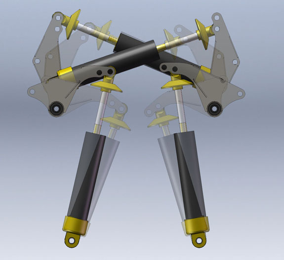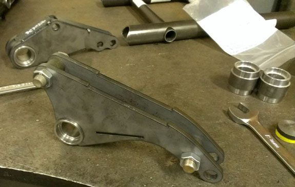 Before we got the D2 back in the trailer I did get a couple quick laps just to test the seats for myself and they work much better than the first version. I'm pleased. Back at the shop much work awaits. The bodywork molds are almost done and I'm eagerly awaiting the completed parts. In the meantime the next batch of seat panels will be ordered so that we can update all the existing cars. 11/06/13 One of the things I"ve been working on is dual-rate bellcranks. The idea is to have a 'track' setting and a 'street' setting, the latter being about 30% softer and slightly higher rideheight, which an owner could change between in minutes. An additional advantage of changing this with bellcranks is that damping stays matched to the springs - both the effective spring rate and damping rate change together. The picture below illustrates the concept. Left side is 'track', right side is 'street'.