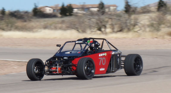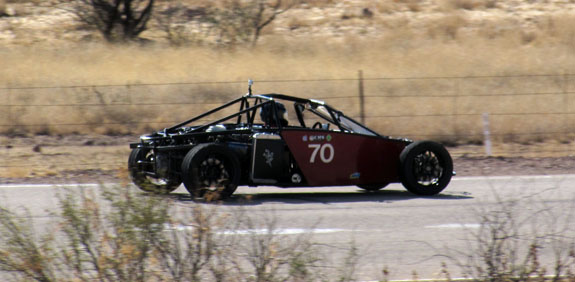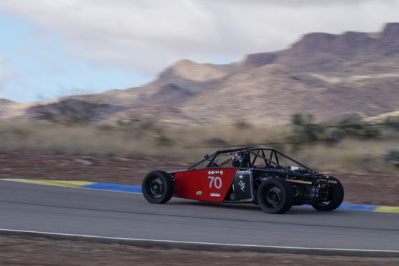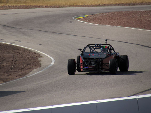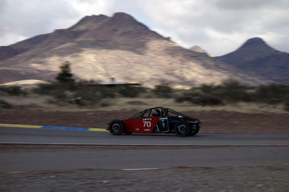 Still needs fenders, a few miscellaneous panels, diffuser, lights, paint, etc. But it's getting there. 12//25/13 A few weeks ago, an opportunity came up to showcase the D2 at Inde Motorsports Ranch. The facility is exactly the kind of place where we want to be so we made arrangements to ship Pete's D2 down there and I booked a flight. As time grew near, however, the trucking company just canceled the shipment and I was faced with the choice of calling it off or trailering 1,600 miles each way in winter conditions. Same as the haul to Pikes Peak a while back other than weather. So I opted for the latter, writing off the non-refundable airline ticket to boot. I try not to let other people's failures stop me :). M agreed to come along but I couldn't convince her to do the straight-through Pikes Peak style drive this time, so we took two and a half days each way. Just as well. It's still pretty stressful to be on the road this long. Fortunately the weather cooperated and the mountain passes on I5 were clear in both directions. One would think that traveling 1.5K miles south would get you warmer weather. Not exactly - we arrived to 32F overnight lows with 45F high, clouds and wind for the first day. But that didn't detract from the awesomeness of the place. Upon entering the grounds it's obvious that Inde is someone's dream made real. I can instantly relate and appreciate. It is a combination of cars and aviation, both of which are passions of mine. There are fighter jets on static display throughout the place and members arrive in airplanes to drive their cars. Yes. Parking the D2 next to one of the aircraft I'm surprised at how similar the profiles are. Form Follows Speed. That's my new motto :)