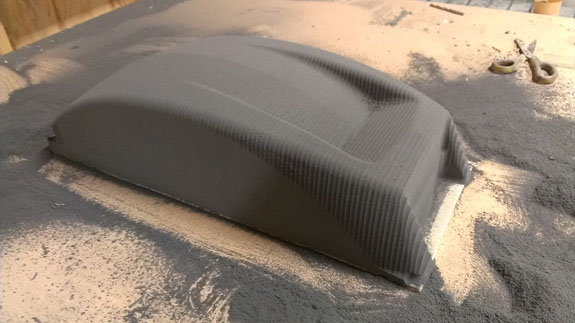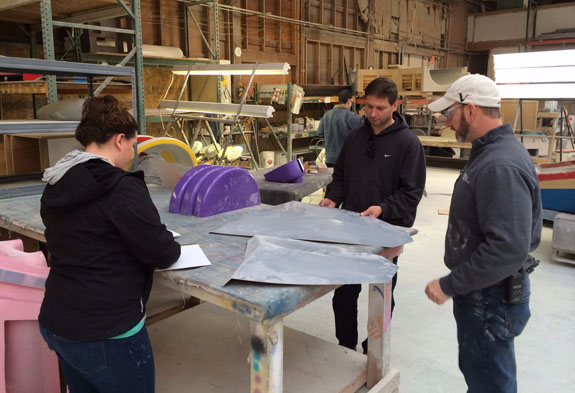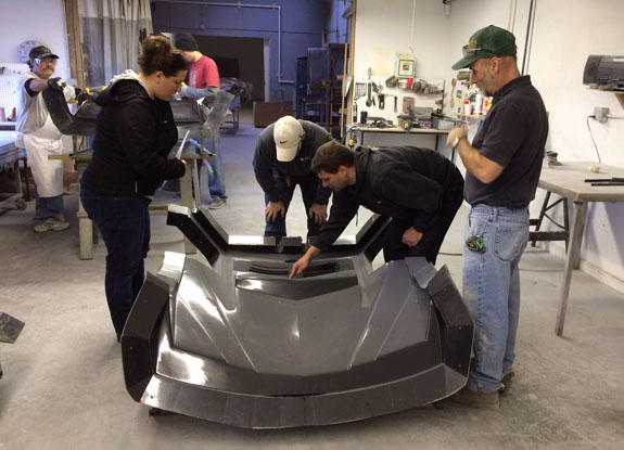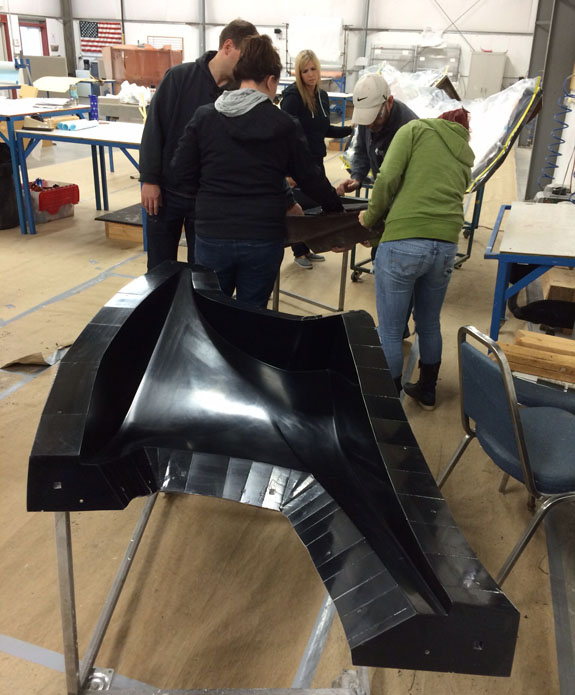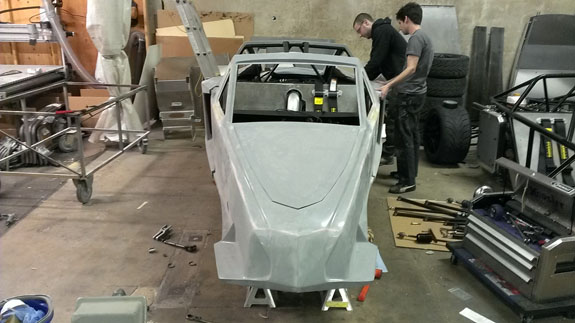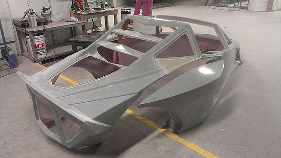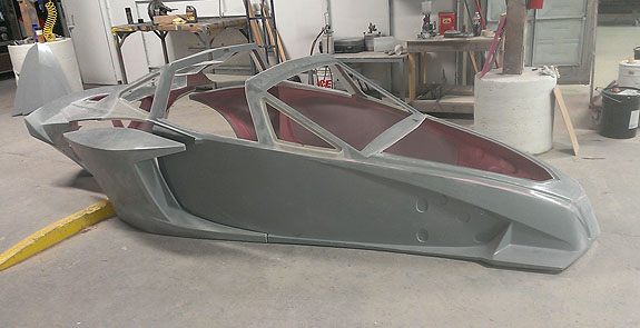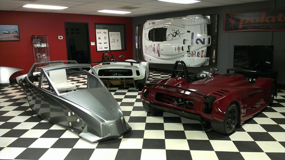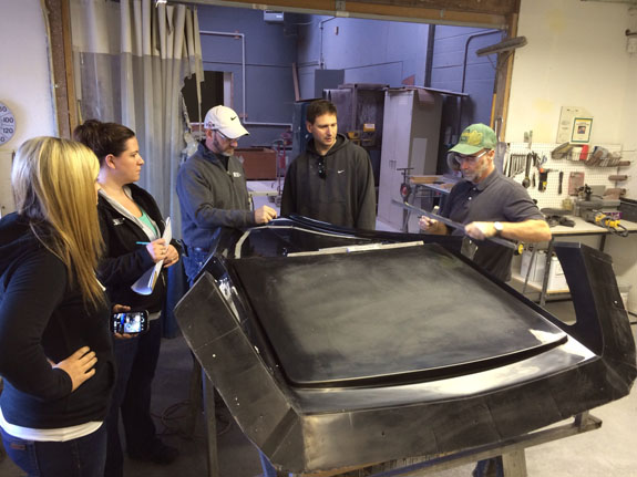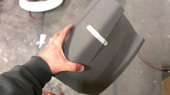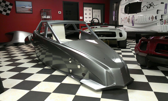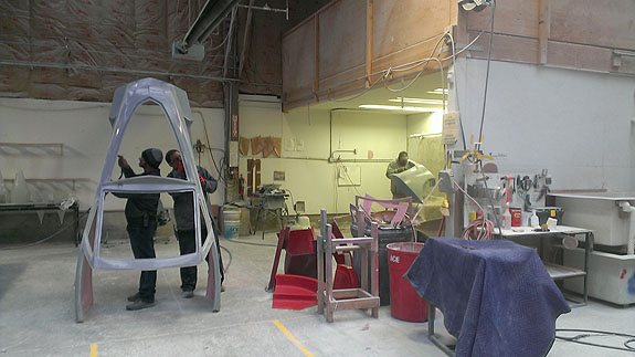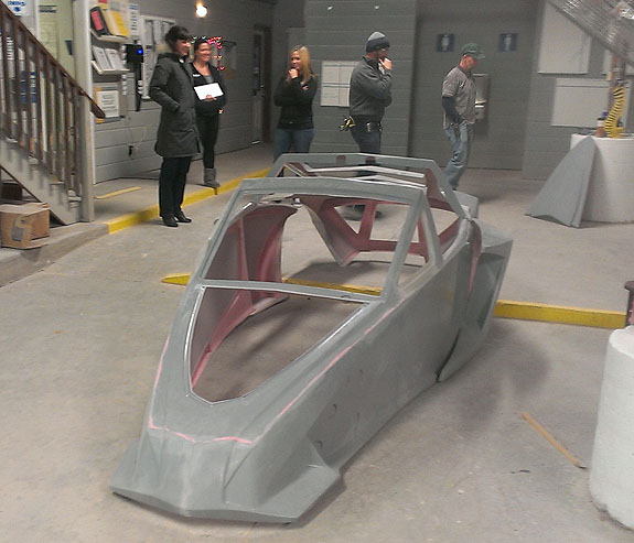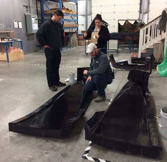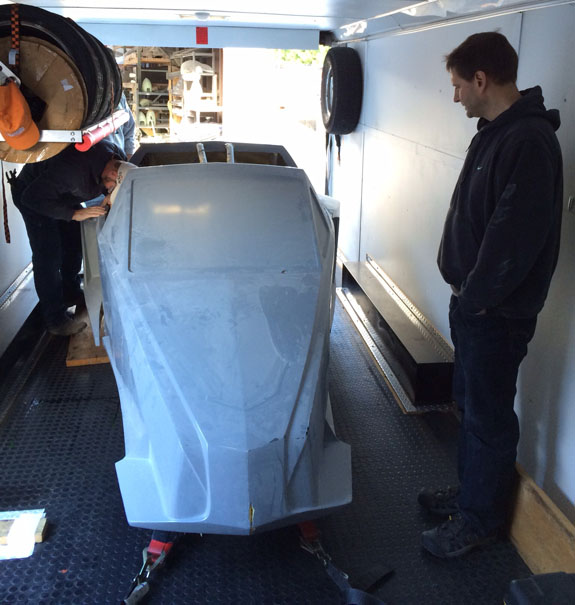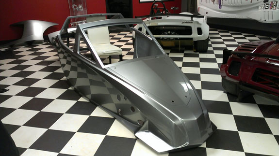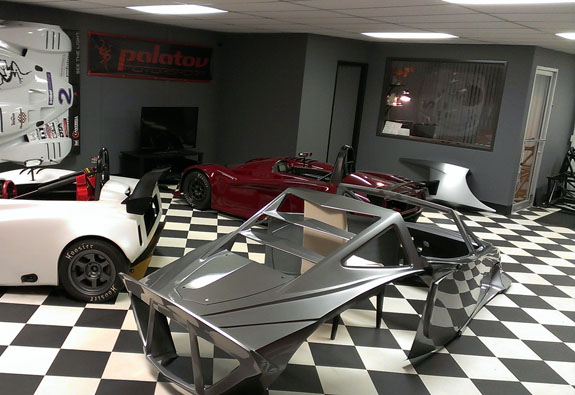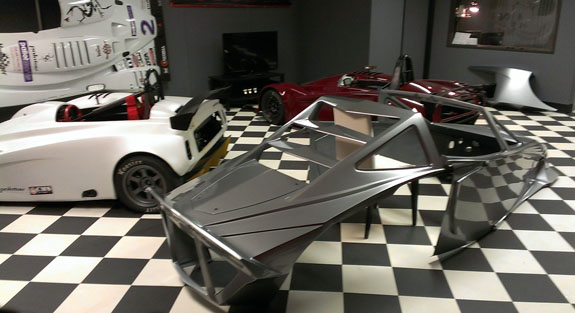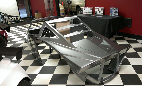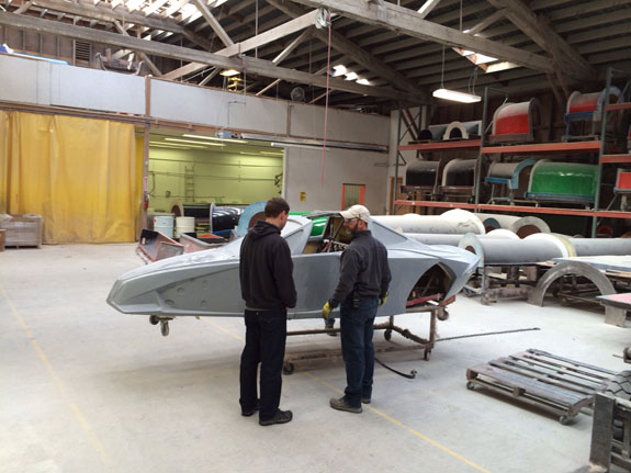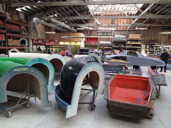 12/02/13 The year is winding down and we're keenly aware of the passage of time. There is so much to do before 2014 rolls in. I feel like I did in the runup to Pikes Peak, and many times before and since. Pressure to deliver is part of what we do. To that end, today I went to retrieve the bodywork plug from our vendor and discuss the specifics of part layup schedules. Pete was kind enough to come along and even take pictures. The molds are completely done, 22 separate pieces in all, and we should have the first set of body panels by the end of the week.
