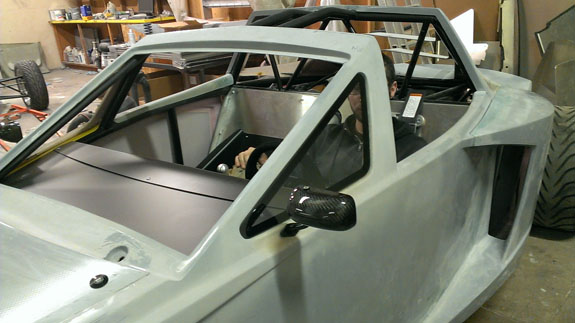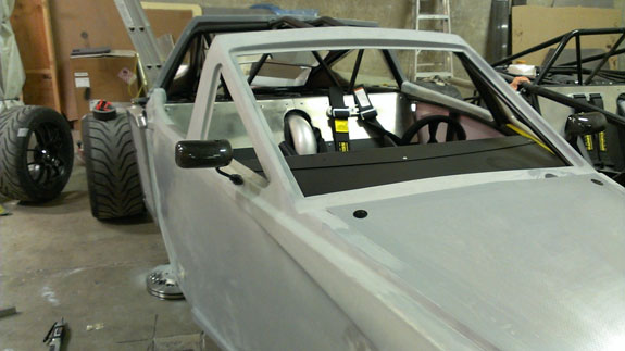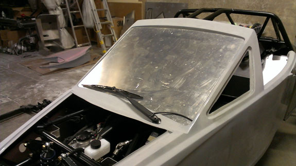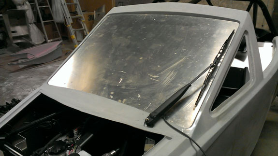 The panels are made of high-temp prepreg composites with nomex core. They are robust, rigid and fairly light - the entire set of bodywork weighs about 75 lbs. Glass adds another 25. The fit is gratifyingly good, although a fair bit of trimming still needs to be done. The glass drops right in and also fits well.