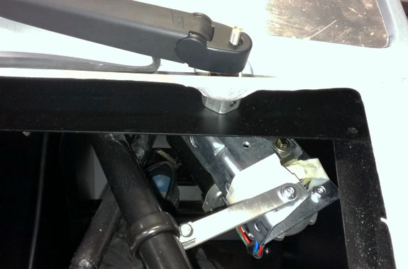 The final windshield wiper mounting scheme is now worked out and is pretty clean. Since the bodywork was hand-made and this area is rather hard to measure I was afraid I"d have to do some convoluted custom bracket but fortunately everything lines up well and the arrangement only requires one hole, a couple spacers and a counter-torque strap.