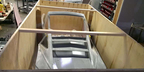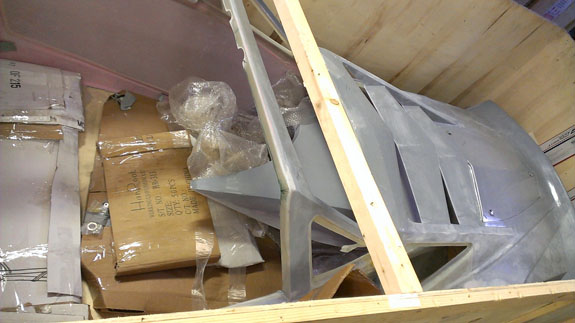 After figuring out the bodywork trimming and mounts we shipped one set to John who'll get it painted and install it himself. Took 400lbs of crate to ship 100 lbs of bodywork and glass. The other four sets went back to M&W so they can tweak the molds and deliver these and future pieces fuly trimmed and ready to go. They're more efficient at this type of work than we are and we already have plenty on our hands :) First one should be off to paint Tuesday, with four chassis eagerly awaiting their new clothes.