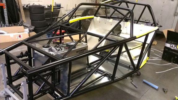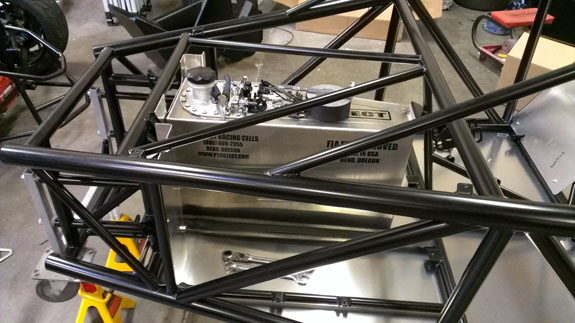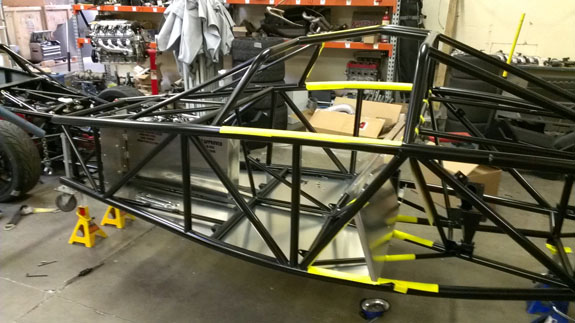 Last but not least, an announcement - we're going racing this year! The #7 chassis will be our race car (we'll put out the sponsor program details in about a month). It will have a 575hp+ supercharged LSA e-rod engine, sequential transmission (both courtesy of Pete), an aero package and a bunch of other goodies. The tentative race plan is One Lap of America, Pikes Peak (Open class), Ultimate Track Car Challenge and Thunderhill 25. All with the same car, with 50-state emissions, 88 db sound and a license plate :) Jonathan Frost will drive. We're already signed up for Pikes Peak, the other races are goals at this point but most likely will happen as we're putting together the resources, team and sponsors. Stay tuned, it's going to be fun! :) 01/29/14 When I start getting emails reminding me that I haven't posted an update in a while it's a sign things have been pretty busy. And they have. A lot of it is just routine production stuff - now that we've run most of the parts on the machines, getting a new batch going is relatively easy. Set it up, then just chage parts out and go do something else while the mill runs (the lathe does require direct attention).. So we've been building parts for the next 6 cars - uprights, pedal sets and so on. , Concurrently there are many other things happening. The #5 is receiving the most attention right now as #1-3 await painted bodywork (we already shipped the #4 body to John in Illinois). Once the frame is powdercoated, the build starts with installing the fuel cell, bulkheads and floor. It's just the most convenient sequence, the cell is removable at any time although 'some disassembly is required'. Just taking the floor off.