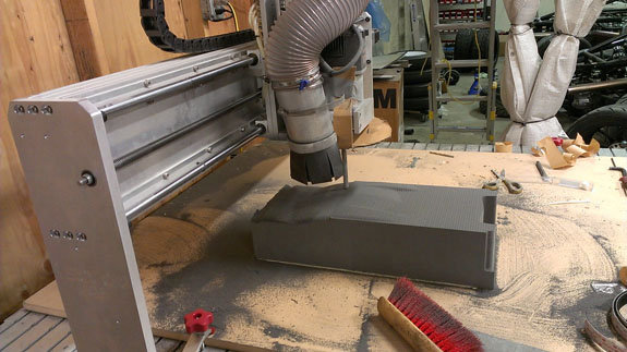 One issue we've run into right away is the machine's tendency to lose its vertical tool offset, the result being either cutting air or digging into the part. The bondo in the pictures below shows what happens in the latter case. The vendor is being very responsive and after having us try a few things they are shipping us a new computer. In the meantime running a part requires someone constantly watching it in order to limit damage if it goes 'off'. Considering that a part takes a few hours to run it's not the most exciting way to spend the time.
