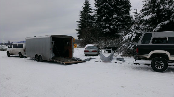02/07/14 The snow is still here but we can't let it stop us. So I arranged for the painter to meet me at the bottom of the hill - he has an AWD truck and took two trips up and down the hill to bring the painted bodywork to as far as I could make it with the trailer. He aso picked up the next one to be painted. Discovered a whole new road hazard today - broken tire chains. There were literally dozens of them, at least a couple per mile, just sitting there in piles. I made it though.