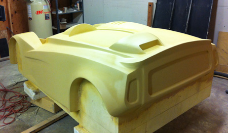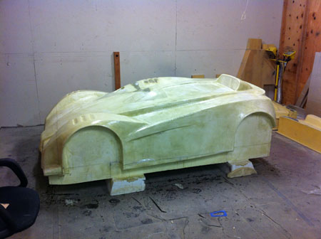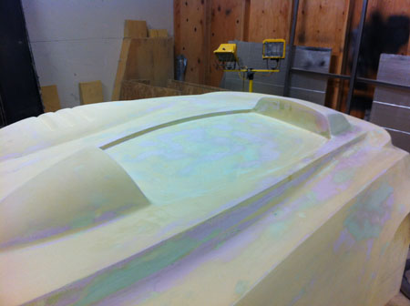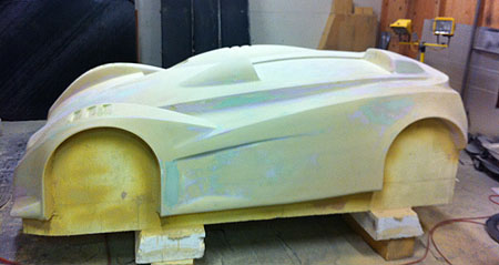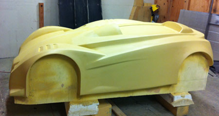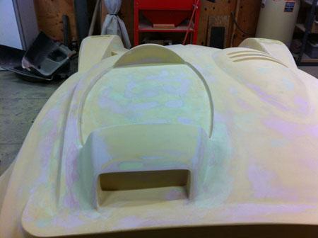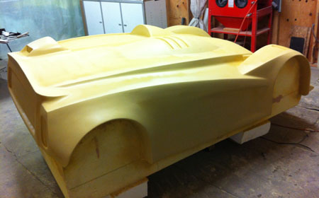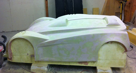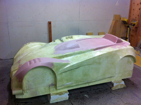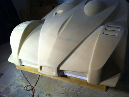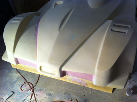 10/23/11 With all the activity on the D1, D2 and Stiletto one might think the D4 is on the back burner. Not so. In fact there are several major things going on. Gaizka, our 'virtual intern' in Spain, has been hard at work running CFD on various configurations of floors, wings and bodywork. We're learning a lot from this. Most of it will not be posted here but one thing I will share is that the 'hump' behind the driver causes more problems than it solves. Turning it into an 'air funnel' helps but not enough. I still want to retain it for styling but it has become clear that the hump needs to be made smaller (well, we basically knew it from earlier simulations but here it is again). I continue to be impressed by how much the flow on top and behind the car affects the function of the underbody and how a seemingly small change can produce a massive difference in overall performance. This has been confirmed with the real-life testing so far. For example, while the rear wing only produces about 50 lbs downforce at 100mph by itself, it has a night-and-day effect on the car overall and is quite sensitive to placement. Somewhat coincidentally I've been working on prepping the new plug (it's nice to do some hands-on manual labor after sitting at the computer all day and I often switch to it for the last couple hours of the evening). I had actually gotten as far as putting bondo on the hump but it was still very open to modification. So that's what I did - it was encouragingly easy and validated a few experiments in the process. And I think it looks better, too, now that I see it.