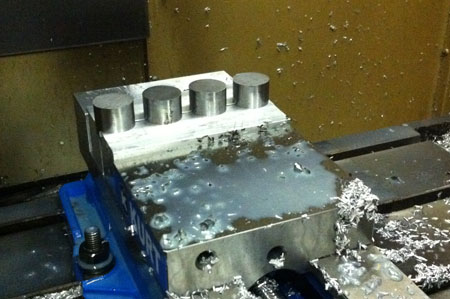 The part is cut from angle stock and uses two vise setups with no fixture and two different tools. Exactly what we need for figuring things out. Yes we'll have to make a fixture for making the bend properly, this one was just a quick test. So, a small part but a big step. Next up is something far more complex (a set of bellcranks and then a set of uprights). We'll see how that goes and what we learn by doing it. 12/25/11 Happy holidays to everyone! Check out our seasonal greetings card (and sign up for the e-mail newsletter, too). The big announcement (already made on facebook) - we are officially moving forward with the Pikes Peak Quest. David Donner will drive our D4 Turbo on the mountain in July in the Unlimited class, going for the overall win. Go big or go home, right? :) The competition is sure to be intense so we have our work cut out for us. Needless to say the car will have to be something special to take on Tajima, Millen and other top contenders, especially since our budget is nowhere near theirs. We're looking at a number of aero options, upgraded drivetrain choices and so on. There are some rules-driven rollcage mods too but I pretty much have them figured out already (reality: safety trumps style when you're faced with sheer cliffs and rocks). It will be a fun journey and will be documented on the sponsors-only blog. Yes, sorry, if you want to track our progress you'll have to join the Quest - we don't exactly want to announce everything we're doing to the whole world, yet. And, well, we can use all the support we can get :) Things that I will talk about here - CNC parts for example. Below are some pictures showing what it takes to make a few simple bellcrank inserts (yes, I'm aware that it would be much easier on a lathe but what we have is a mill so we have to make do). It starts with making a set of 'soft jaws' for the vise. Basically two blocks of aluminum that are bolted in place of standard jaws (having been previously machined to fit) which then have some features machined into them to hold the parts. The fixture is assigned a part number (as is the program) and will be used for these parts from now on.