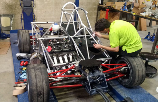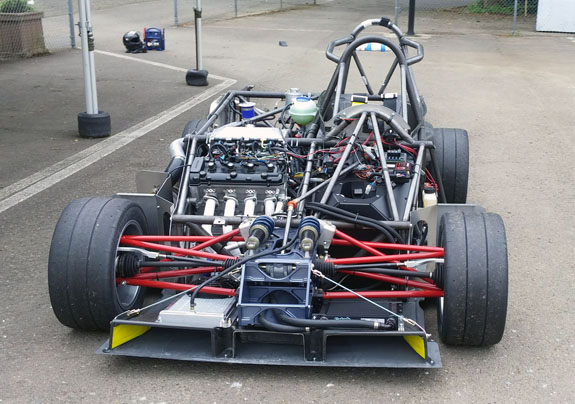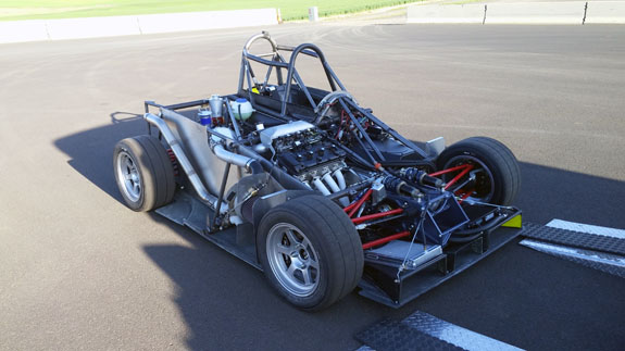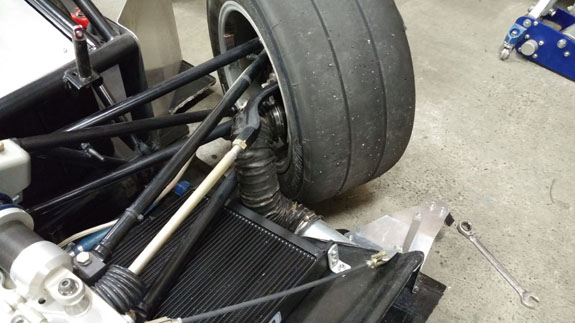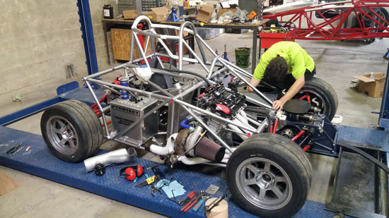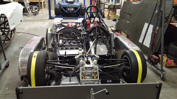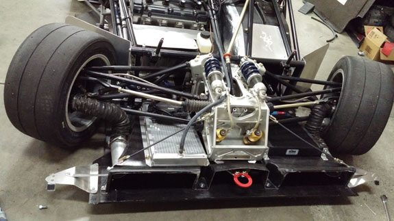 The car is FUN! :) AWD is working great and even with cold tires manages to put all the power down. You can feel it scrambling for traction but it gets the job done. Throttle can be applied crazy early in a corner and the car just tracks out. Lift-throttle can be used to rotate it to get pointed in a direction and then just nail it. This is also the first time on this bumpy track with the new patent-pending bellcranks and the car is totally planted. You can see some of that in the video. This is definitely my favorite D4 configuration - AWD and turbo. I need to build one for myself now :) But before that, this car will get taken apart, a couple details finished up, powdercoated, painted and then put back together and finally delivered to a very patient customer. Unfortunately no onboard footage this time - we really need to get a couple new GoPros, the old ones are first generation, have seen a lot of wear and tear and are just not working well anymore. In another bit of D4 news, the rFactor2 mod is now officially released - check it out. 07/08/15 Upon the return from our second Pikes Peak class win (in as many tries), we hit the ground running. Lots of projects await. Completion of the turbo D4 is one of them. Building Sector111 Drakan cars and continuing work on the Stiletto are others. The frame is back from powdercoat, it looks good in silver! So the assembly is now coming right along.