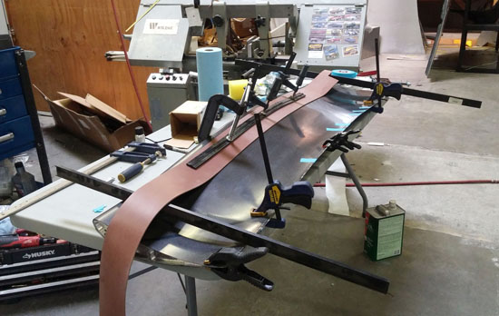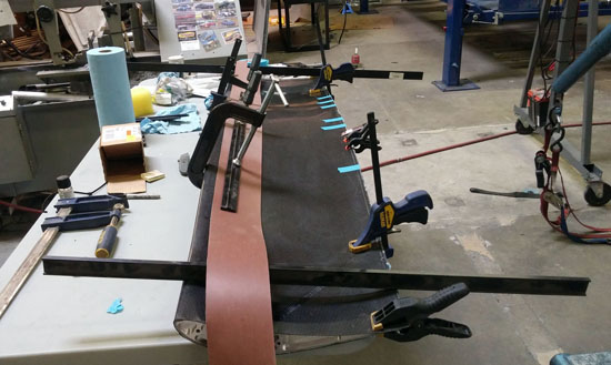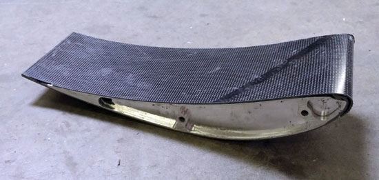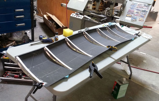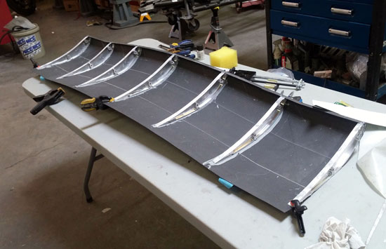 The wing side of the mount is bonded under a rib and then a pair of rivets are used as mechanical backup. The final step in the design was to finalize rib locations that would be compatible with mount locations on the bodywork and the underlying frame hardpoints. While the wing attaches to the body shell for convenience, loads from it are supported by the frame underneath. To make the wing, the ribs are first bonded into the lower skin at predetermined locations. After the adhesive sets, the upper skin is bonded on. The straight pieces you see in the last couple pictures allow making sure there is no twist in the wing as it cures.