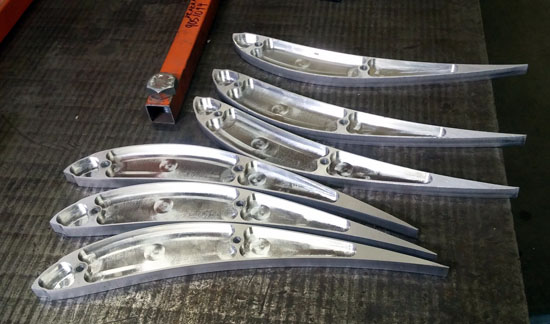 In the process of getting the Pikes Peak car ready we learned a few things about wing construction, so I'm now applying this to making a new wing for the D4. The key change being the use of aluminum ribs, with a layer of epoxy adhesive electrically isolating them from the carbon skins while providing a solid bond. A few experiments with different adhesives were in order, primarily to figure out the best work time and mixing/application procedures. First, a batch of ribs are made on the CNC. They end up weighing 0.2 lbs each so five of them make a pound. The airfoil itself is an Eppler profile originally developed for high performance gliders. I chose it because we operate in its design R number range. CFD in Solidworks has already confirmed that it works and Pikes Peak testing provided a reality check. Jonathan could tell the difference even with minor adjustments and everything worked as expected. So now we just have to get the construction process refined.