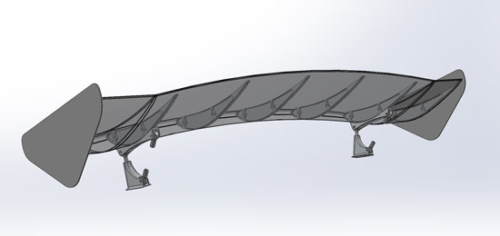 Another test with a slower compound produced good results and after letting it cure overnight, I could not pry the test piece apart without physically breaking things. So the bond is good. Next step is finishing the design of the billet mounts. We've used fabricated ones previously but I wanted something nicer and more production-oriented. I didn't go with a 'swan neck' design because in this applicaton it wouldn't have produced any meaningful gains but would have been a huge pain to make. So just a nice, manufacturable bottom mount setup with some adjustability for angle. Vertical location was already checked in CFD and tested in real life (including our 2012 Pikes Peak effort).