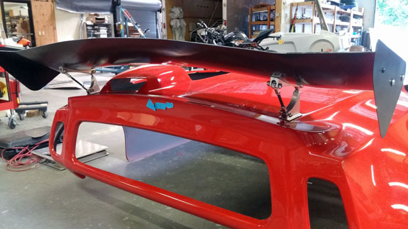The wing mount is attached to the bodywork for ease of removal but is supported by the frame underneath for actual aero loads.