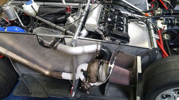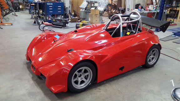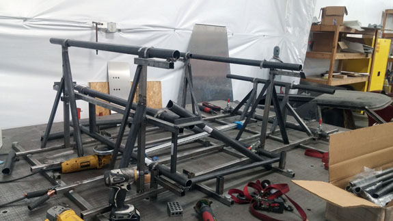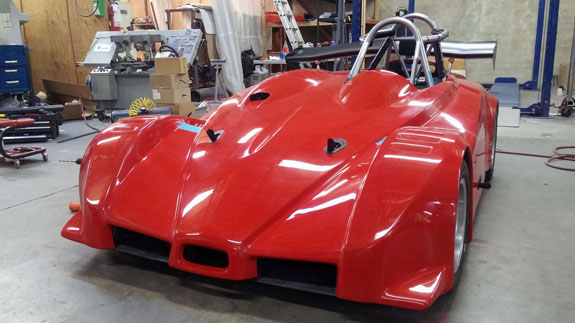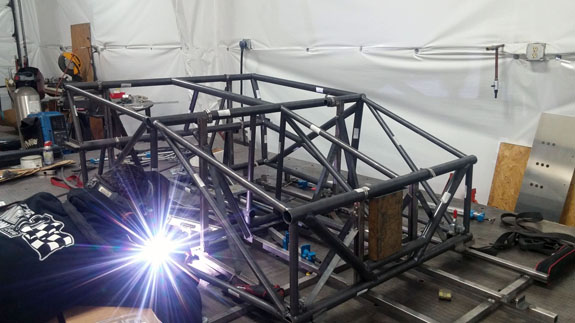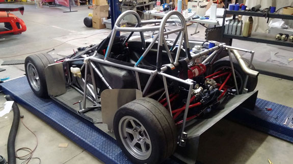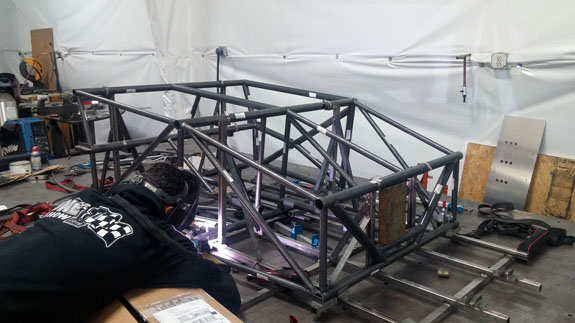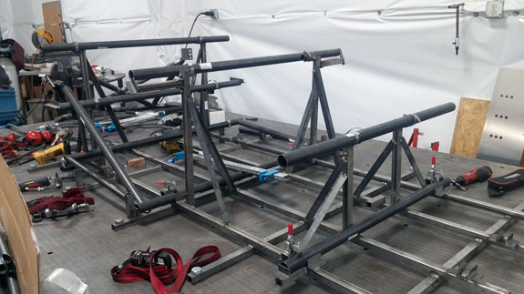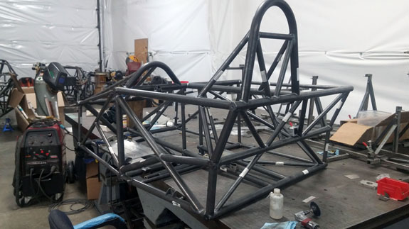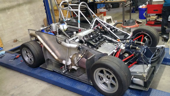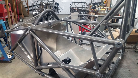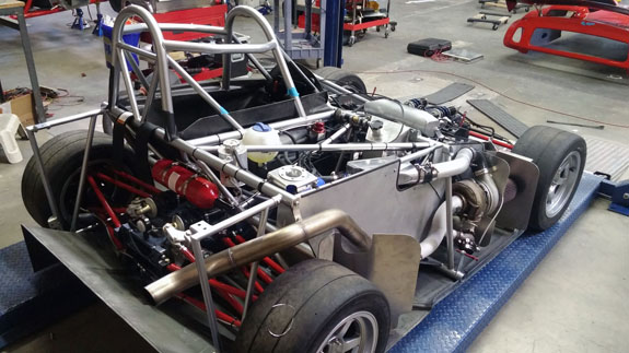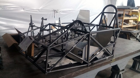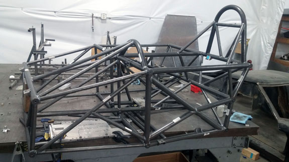 You can see the 'overbuilt' safety cell of the frame, made up of 1.5" OD, 0.120" wall seamless chromoly tubing. Even though the car will weigh around 1,000 lbs, the frame is built to SCCA specs for cars over 2,500 lbs. For this car's turbo system we're trying something different, at customer request. The previous car was built for high power so it has lowered compression, turbo pistons, high strength rods, and a GTX2860R turbo with 0.57A/R housing for quick spool-up. That setup works really well and is good for 400hp on race gas at 14psi. This one will be much milder and will only see 5-6 psi boost. We've looked at compressor maps and it actually may be that a larger turbo will be more efficient a the power levels we're looking for (250-280hp) and low pressure ratios. So we're trying a larger GTX2867R with same 0.57A/R housing. There will probably be a bit more lag, but stock compression should help, and the fact that we're shooting for very mild boost levels means it'll reach 'full' boost easier. Like I said it's an experiment that the customer is fully onboard with so we'll see how it comes out. Drysump systems have been ordered for all three cars in progress, turbo is on order, the frame for the newest car is on order as well, and we're finalizing order details on the bodywork. Oh, and we'll be building trailers for the cars as well and naturally there are some updates to those designs that are in progress, like the much-delayed weather protection canopy. 01/02/17 First post of the new year goes to the D4 blog. As mentioned earlier, we're building three D4s currently. The most advanced, both in terms of spec and progress, the AWD Turbo car, is coming right along. Some final tabs are being added to the frame before it's fully ready for powdercoat.