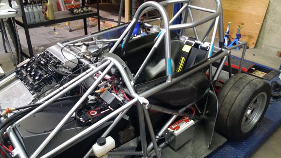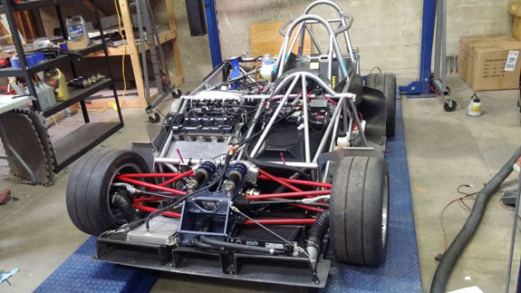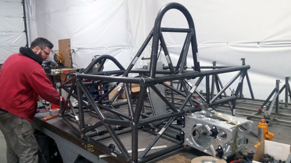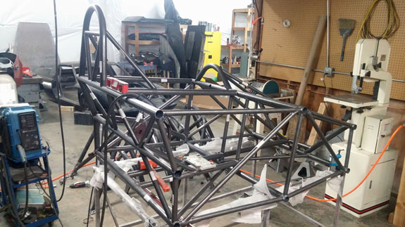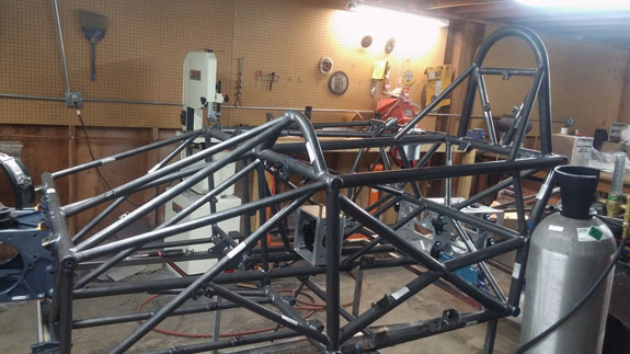 All the while both Tristan's 'old rev' car and the customer AWD chassis are coming along. You can see the difference from the early rev thin tubing to the much more substantial (1.5", 0.120" wall chromoly) of the current frame. The original car was designed to SCCA spec for the weight class, the current design far exceeds it.