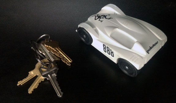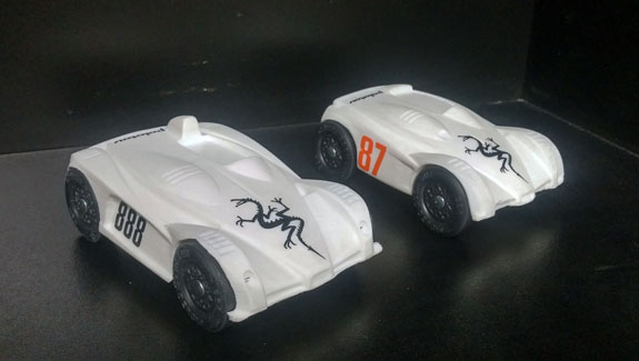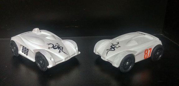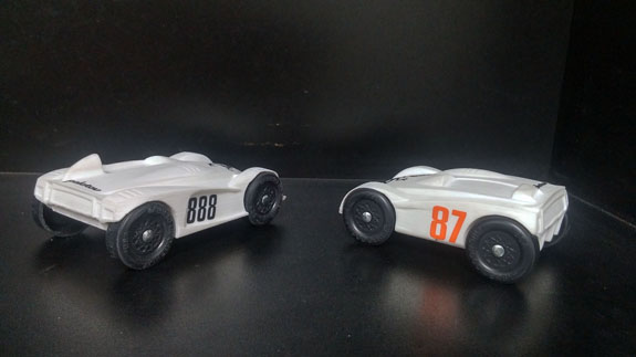 Once the engine and wiring harness are out we'll eBay the rest. If anyone is interested in any of the parts (or the whole thing), now is the time to let me know. And finally a random D4-related item. We were recently approached by a Cub Scout organizer to make a couple Pinewood Derby cars for their fundraising auction. Since we didn't have to worry about official rules so much we decided to do a 3D printed version of D1 and D4. I tweaked the design to accommodate the way-out-of-scale wheels and Jay was kind enough to print them on his personal 3D printer. Came out pretty cool :)